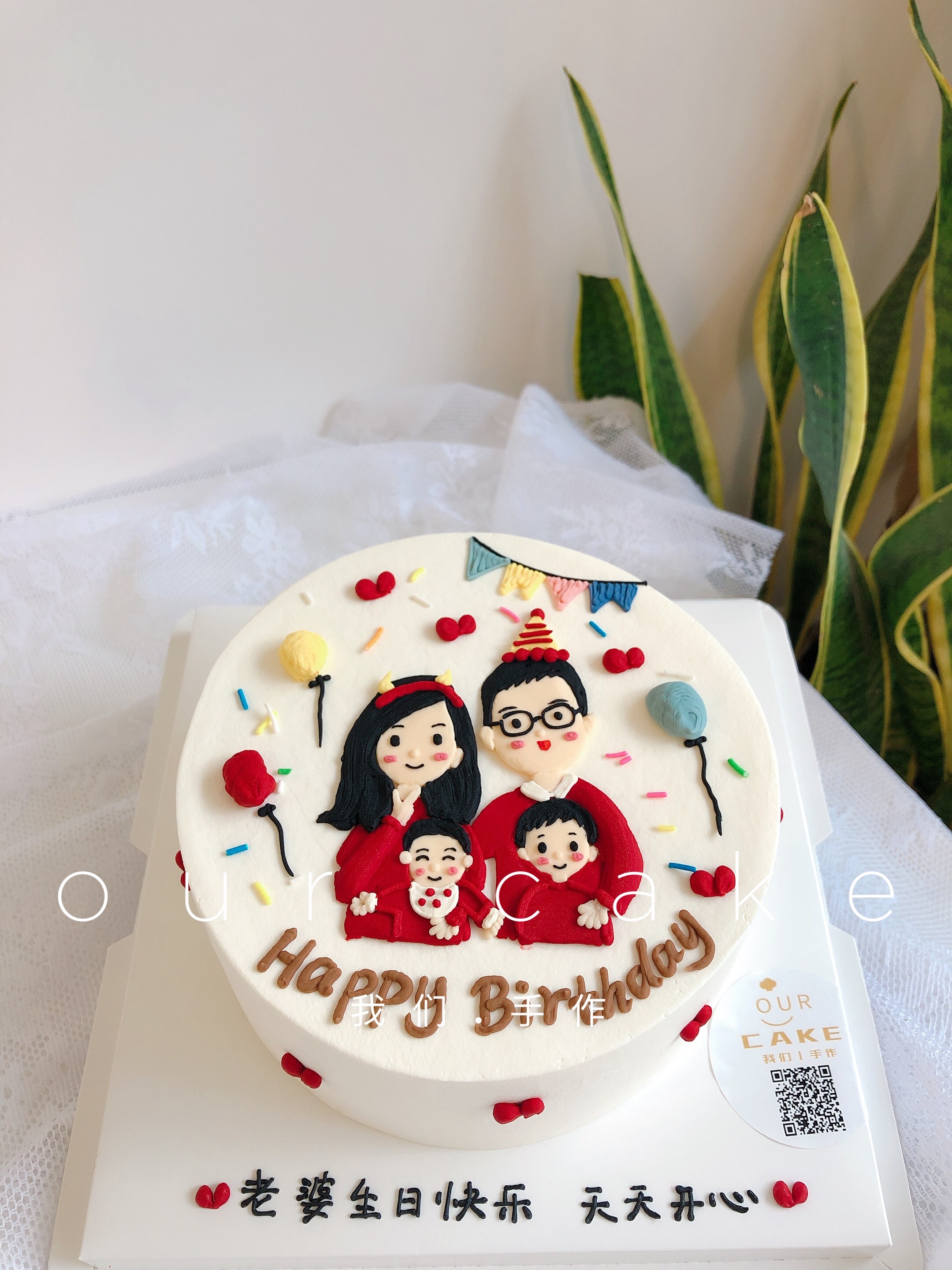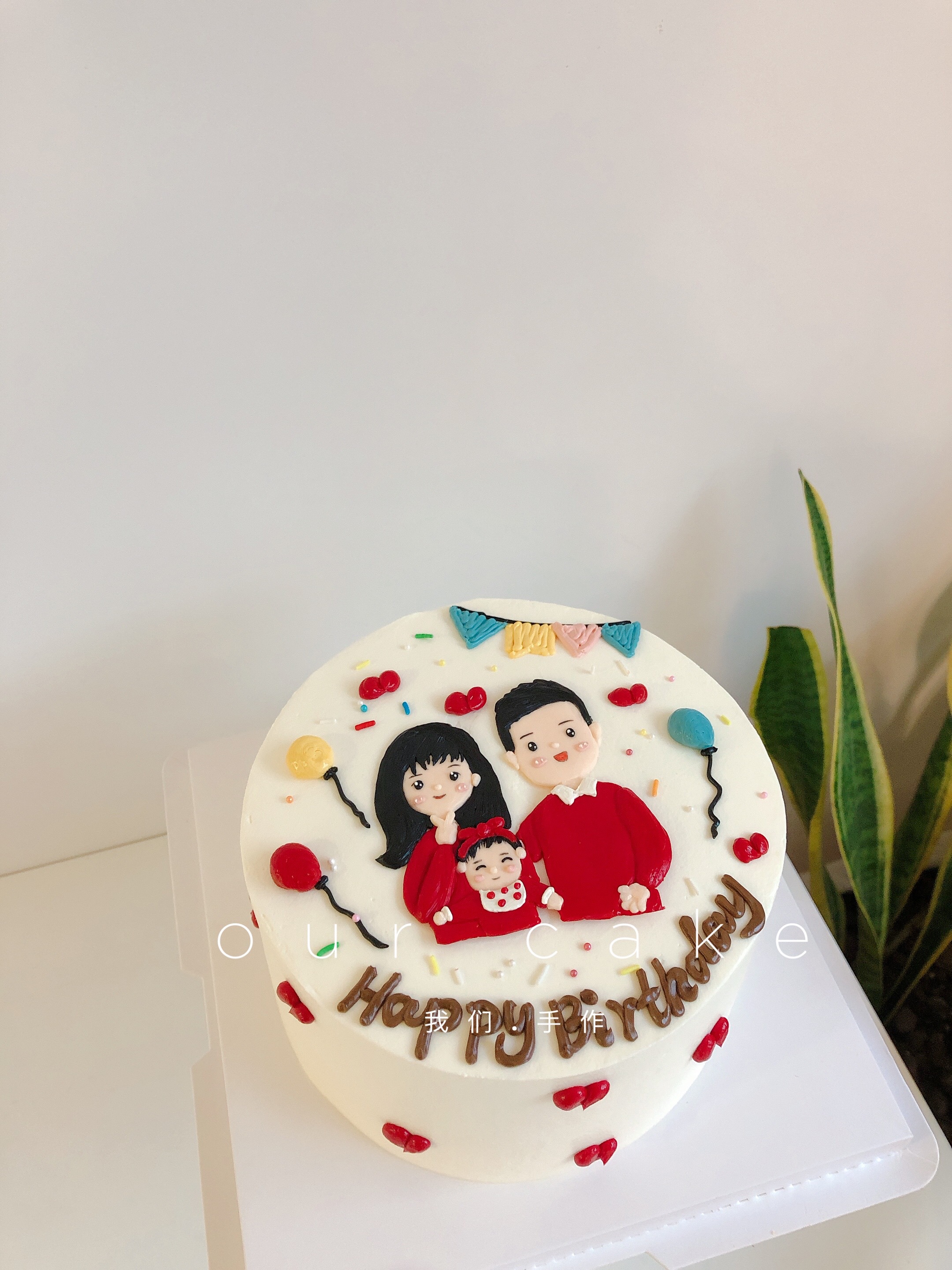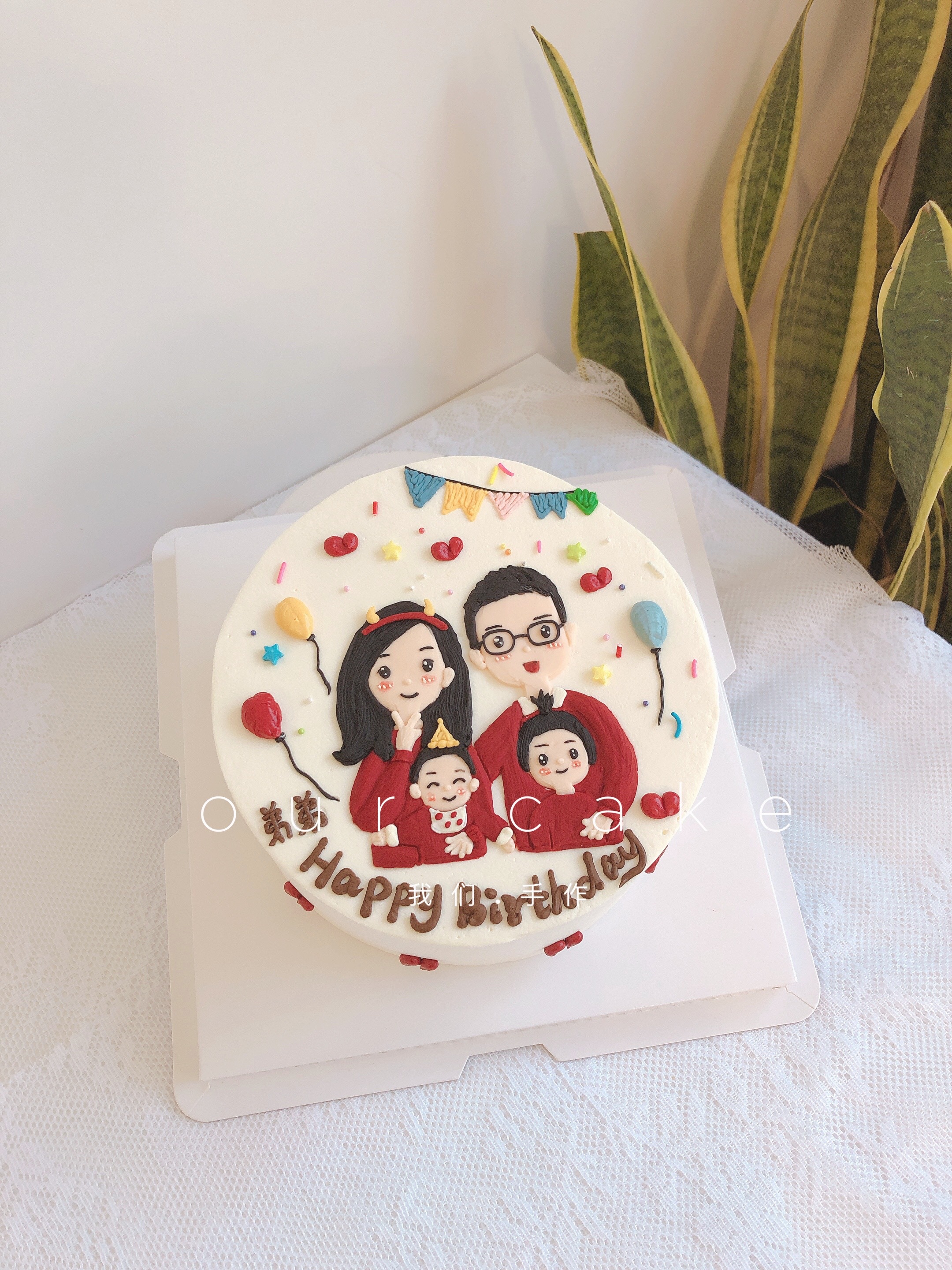 手绘一家人红色衣服手绘蛋糕-低糖处理无添加