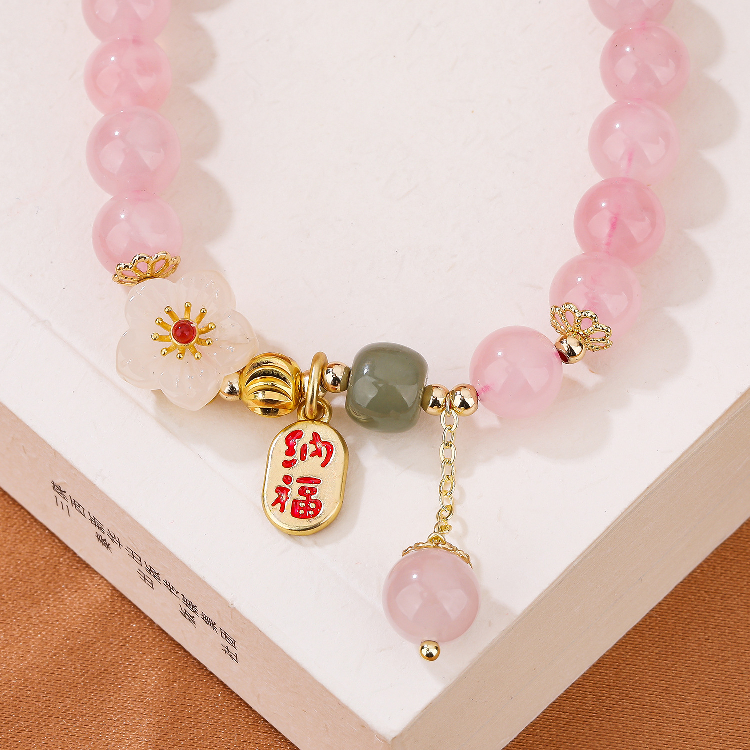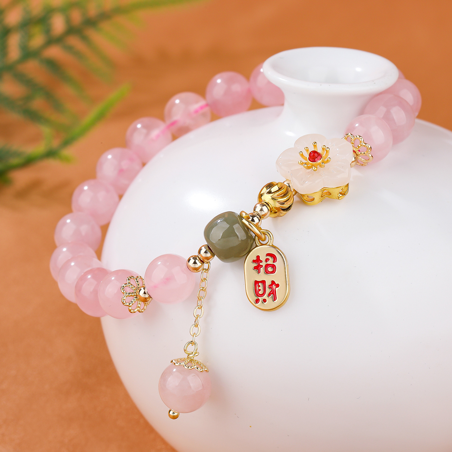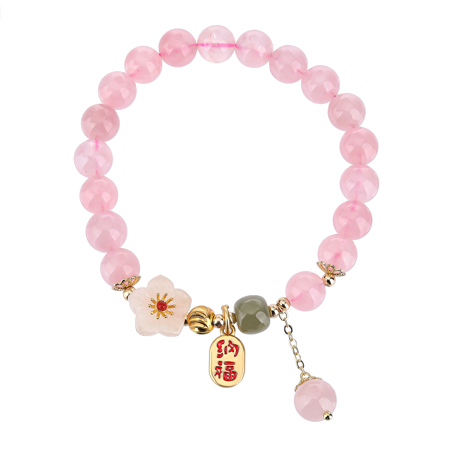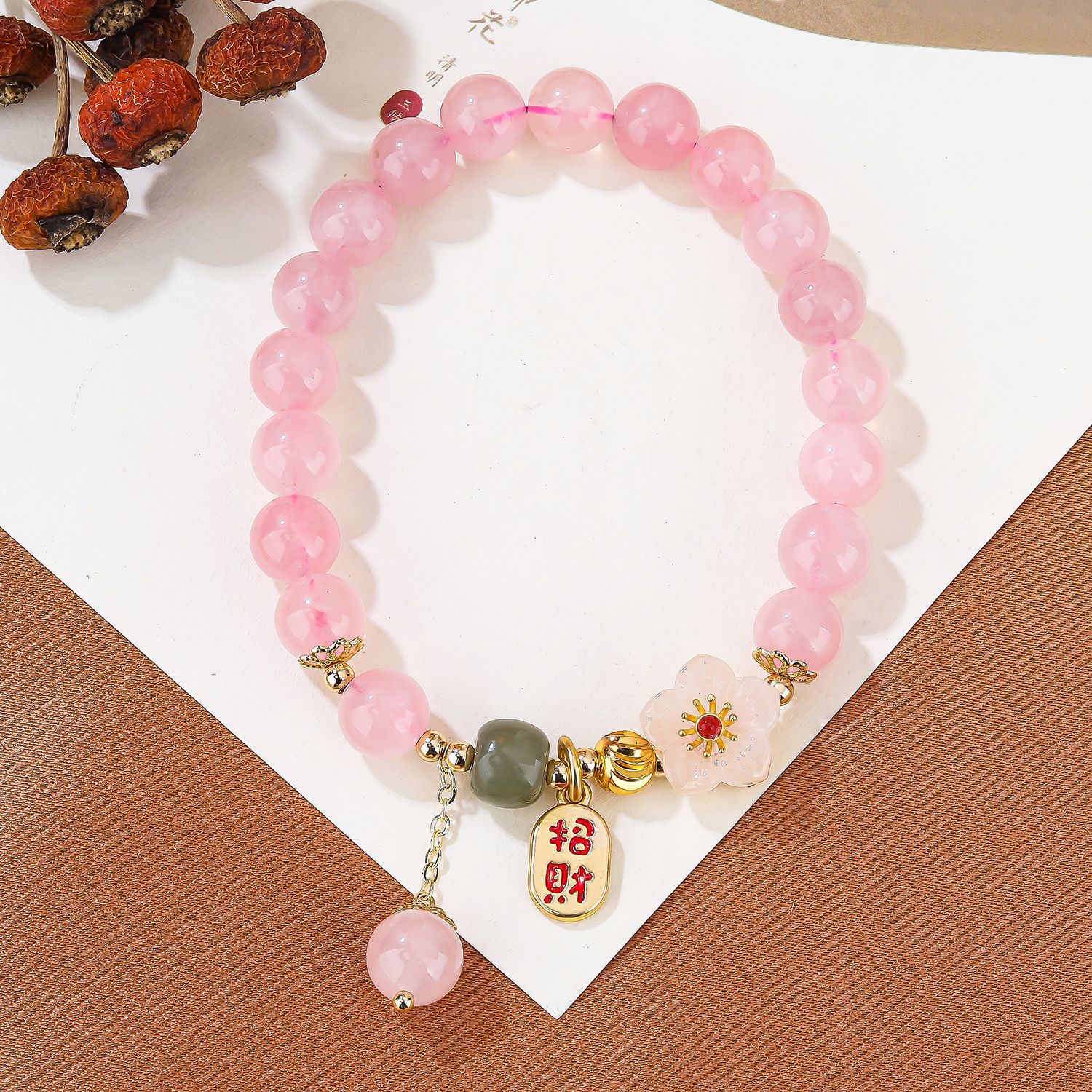 【商品名称】天然粉晶铜配饰花朵单圈手串