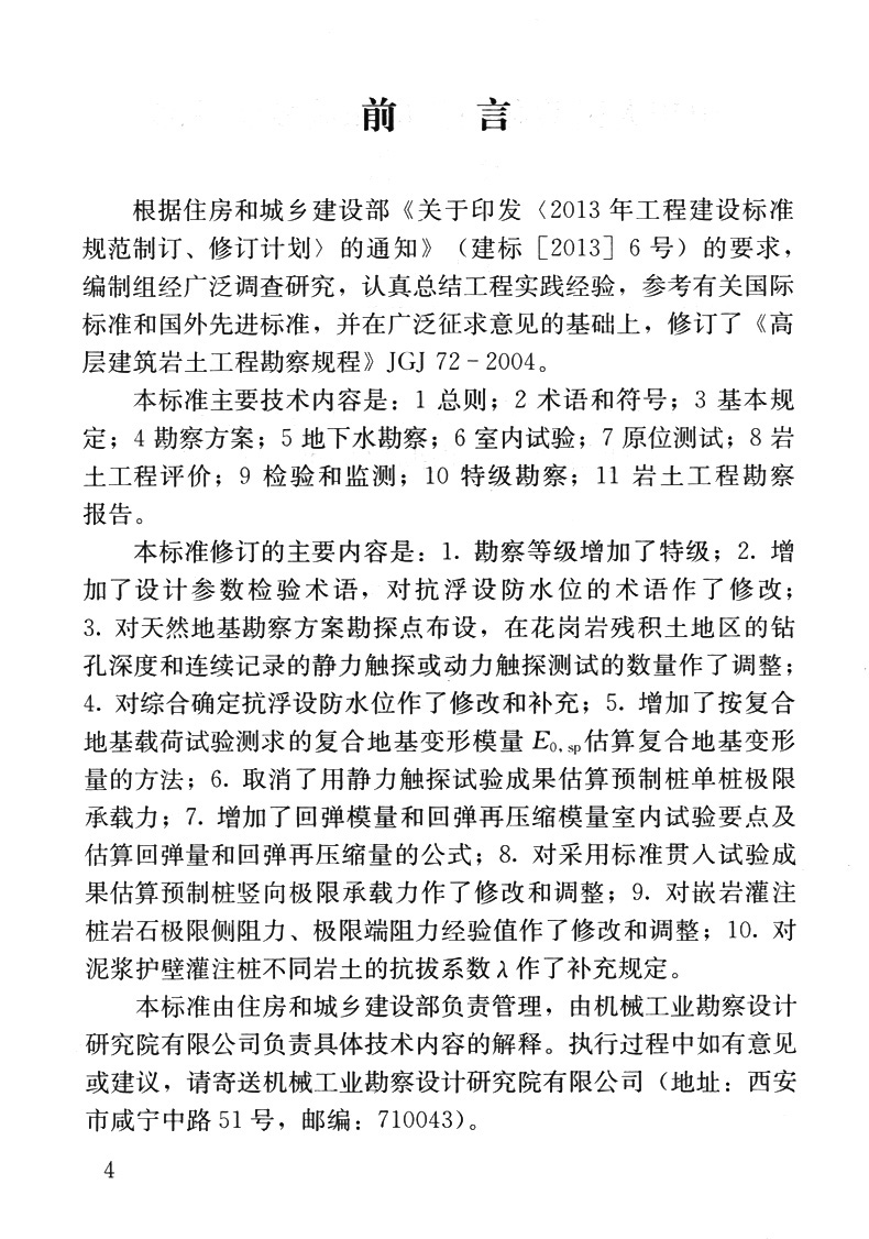 本标准主要技术内容是:1.总则;2.术语和符号;3.基本规定;4.勘察方案;5. 地下水勘察;6.室内试验;7.原位测试;8.岩土工程评价;9.设计参数检验、施工检验和现场监测;10.特级勘察;11.岩土工程勘察报告。 本标准由住房和城乡建设部发布,2018年2月1日起实施。原《高层建筑岩土工程勘察规程》JGJ/T72-2004同时废止。