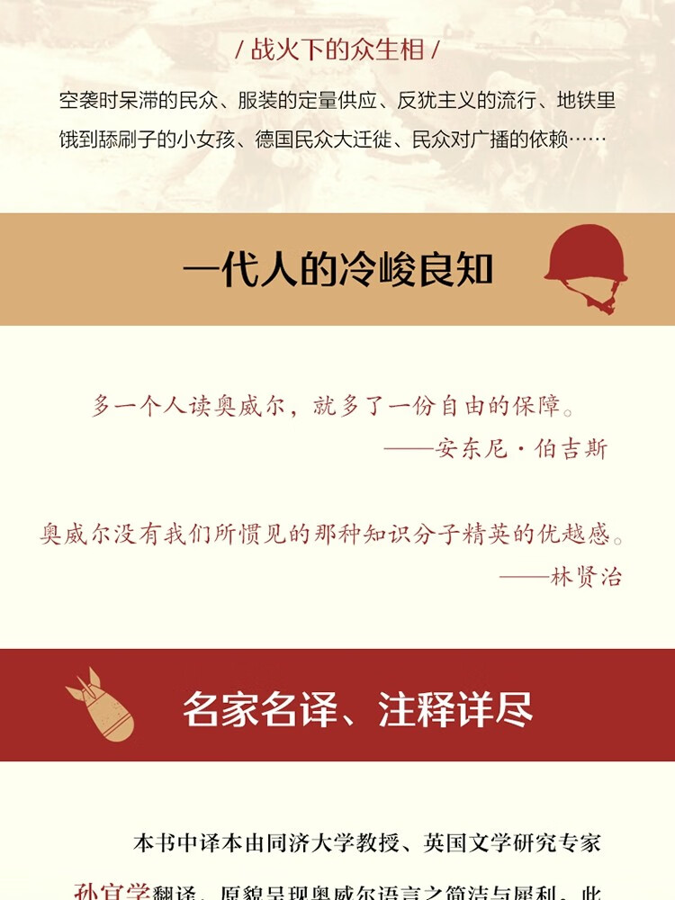 本书中译本由同济大学教授、英国文学研究专家孙宜学译自企鹅出版集团1970年版,版本权威,译文忠实原文,原貌呈现奥威尔语言之简洁与犀利。此外,译者增加了大量注释,对书中出现的历史事件和历史人物进行了细致交代,方便读者了解相关背景,更好地理解作品的内容。