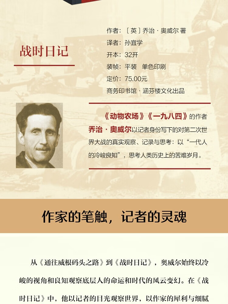 乔治·奥威尔是英国著名小说家、记者和社会评论家,被誉为“一代人的冷峻良知”。《战时日记》是奥威尔在第二次世界大战期间所写的书信和日记摘选。他以高超的叙述技巧和冷峻的视角,抒发了对战争的反思,披露了很多鲜为人知的内幕,刻画了群众在战时对各种事件的反应,以及普通人的境遇与命运,史实、思想与文笔并重。通过奥威尔的文字,我们能感受到人虽渺小如沧海之一粟,但与时代脉络紧密相连,时至今日仍能够给予我们鲜活的启示。