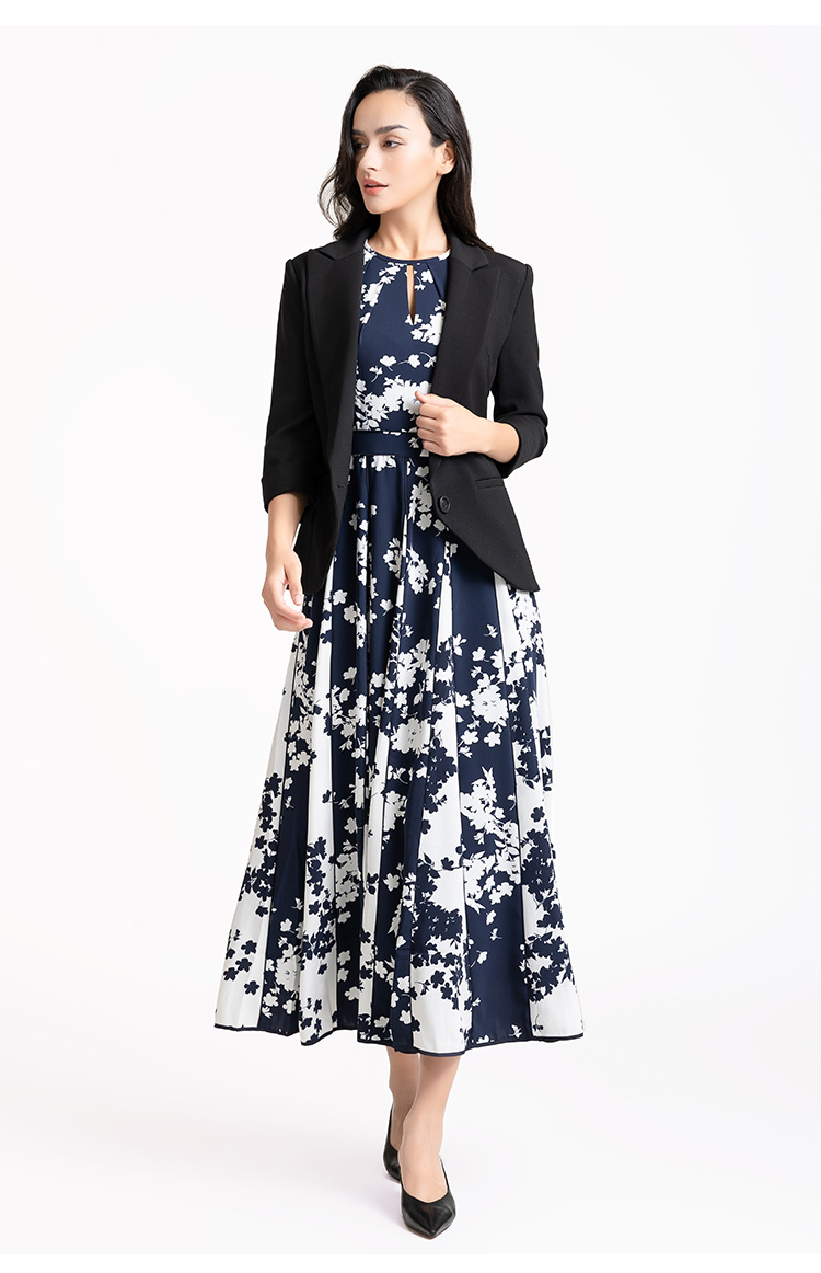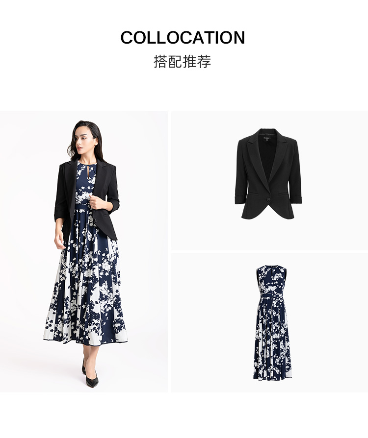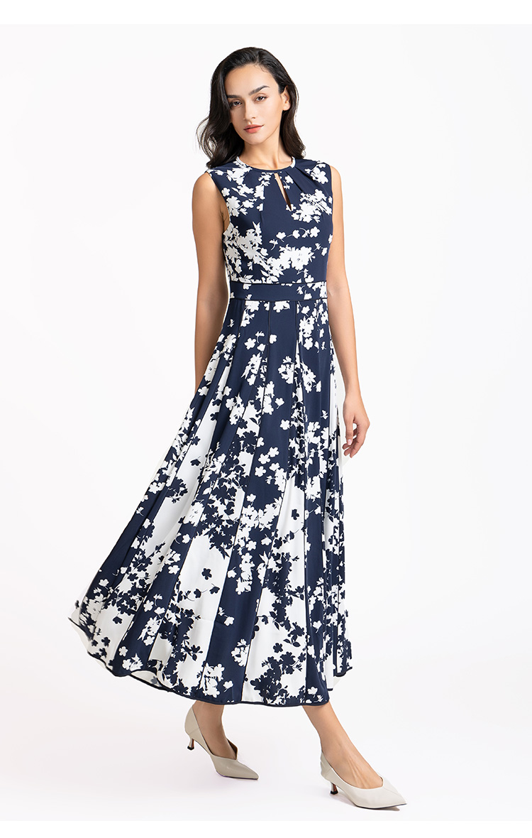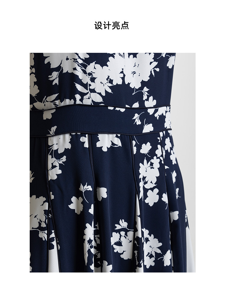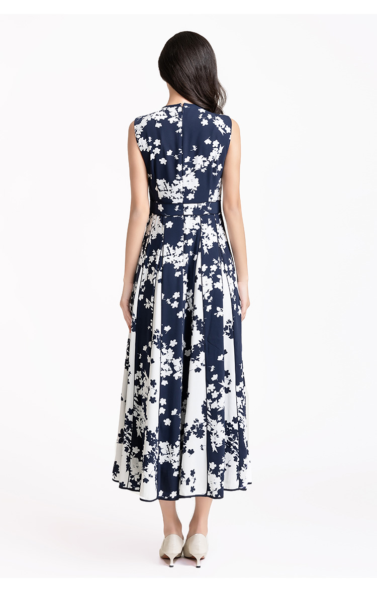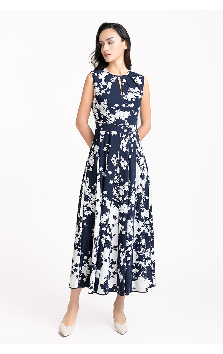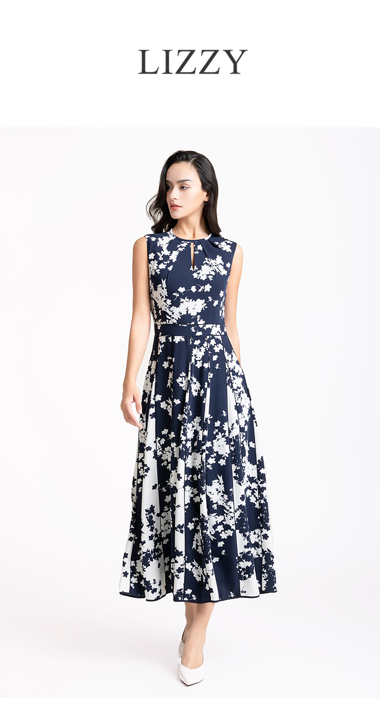 LIZZY 优雅赫本风无袖高腰镶拼条大裙摆显瘦印花连衣裙7914