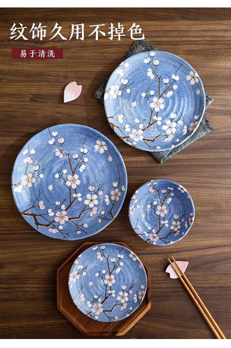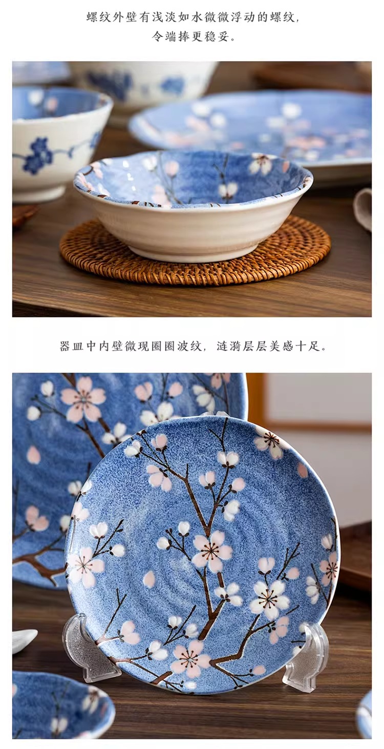 【特惠7折,仅2套,无货退款】日本进口富士樱花盘子餐盘平盘蓝色陶瓷家用日式餐具汤碗组合套装富士樱12件套装