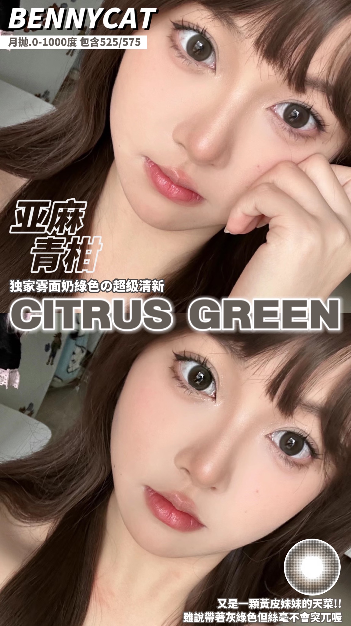 Bennycat 亚麻青柑 月抛 2片 14.5mm 参考着色 13.7mm 基弧 8.6 含水 42% 新锐国货