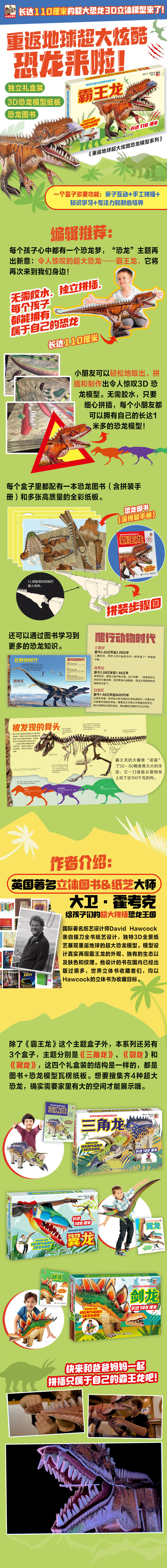这是一套适合4~8岁儿童使用的科学读物。本书中简要介绍了霸王龙的相关信息,以及搭建恐龙模型的指导说明。小朋友通过本书可以轻松地制作出令人惊叹3D 恐龙模型。模型长达90 厘米。根据书中的步骤说明,并不需要胶水,小朋友通过拼搭就可以完成D 模型。模型逼真,真实的再现了恐龙的外观,独有的神态,以及肤色,纹理。