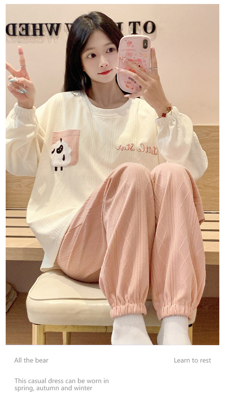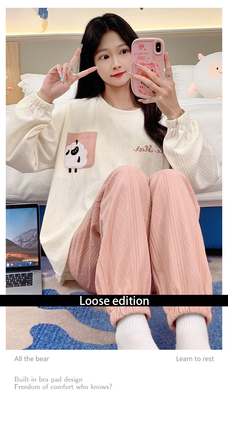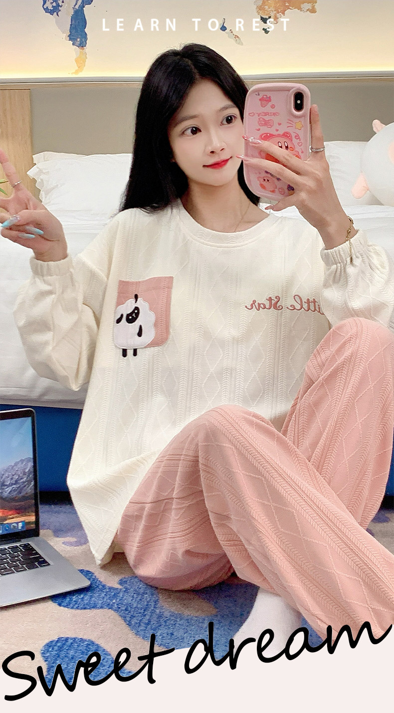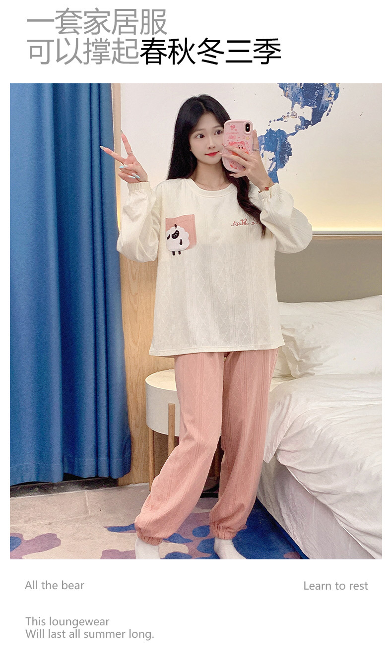 秋季新款学生家居服可外穿带胸垫睡衣女春秋季提花棉长袖圆领甜美可爱可外穿女士家居服套装
