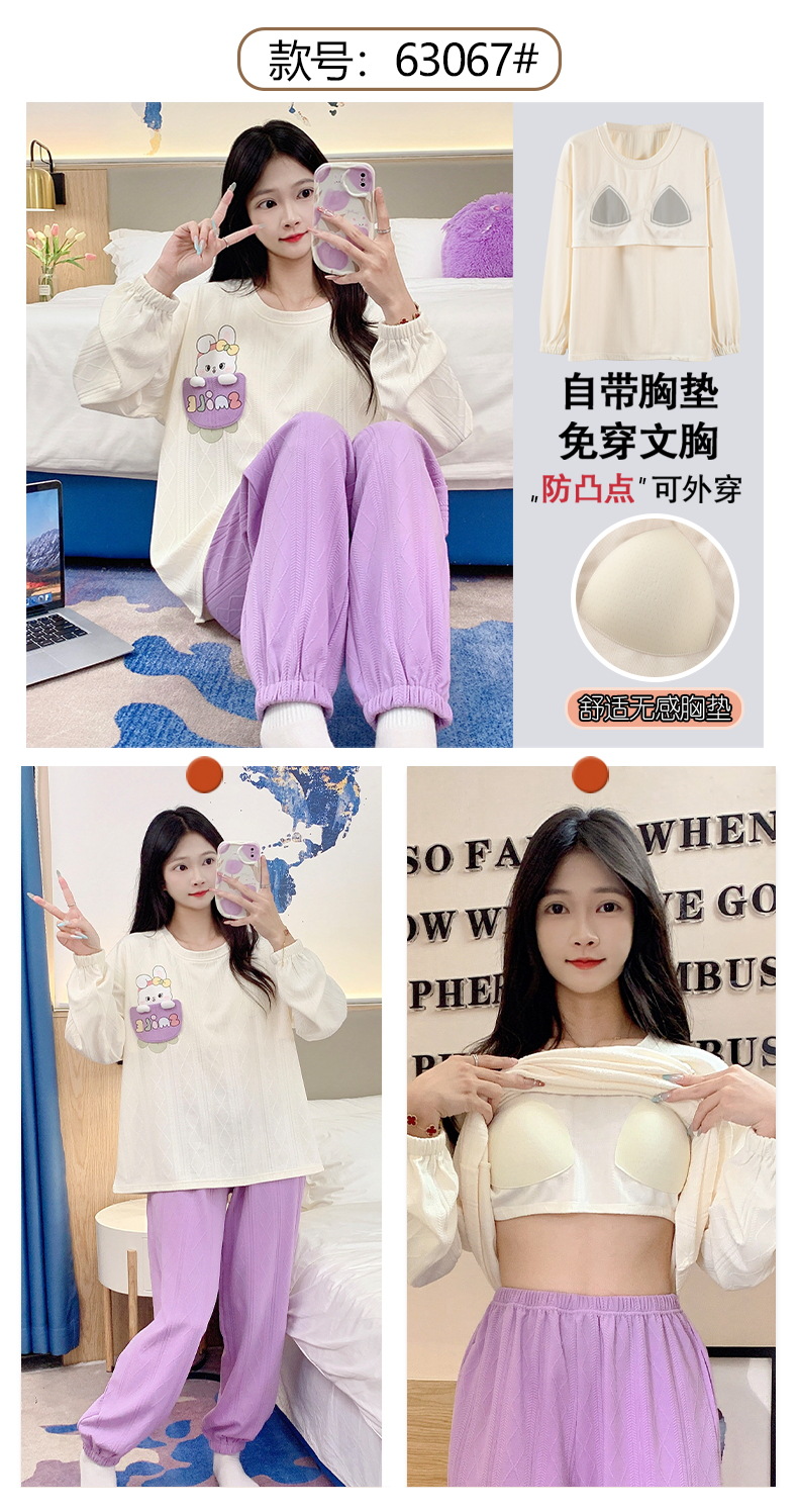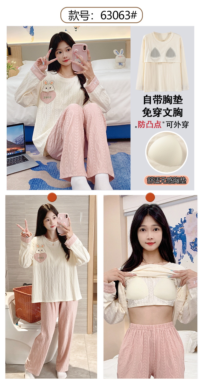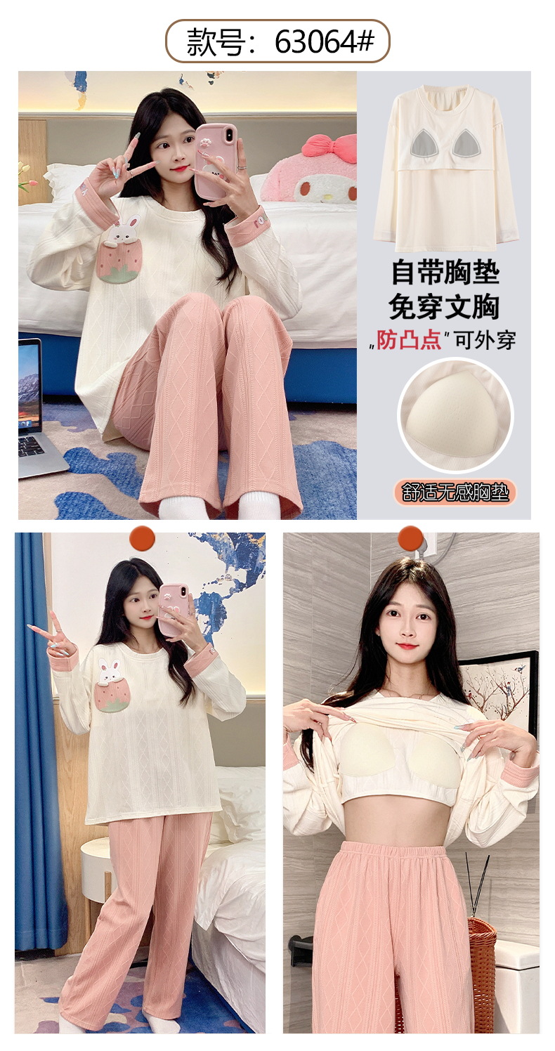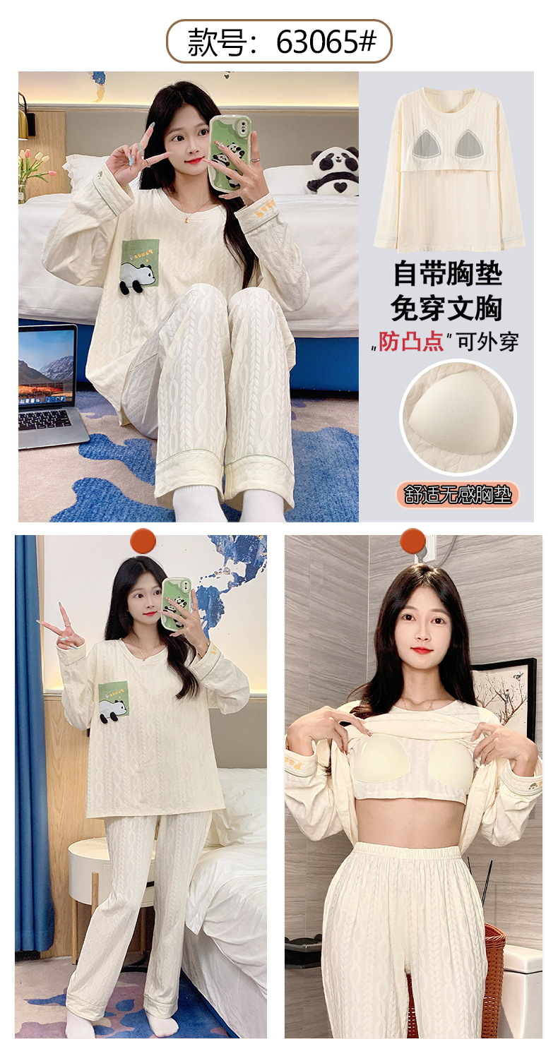 秋季新款学生家居服可外穿带胸垫睡衣女春秋季提花棉长袖圆领甜美可爱可外穿女士家居服套装