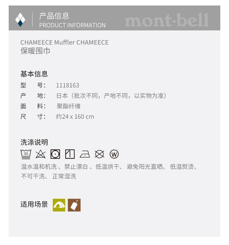 MONTBELL秋冬男女同款运动日系户外保暖百搭围巾柔软抓绒围巾1118163