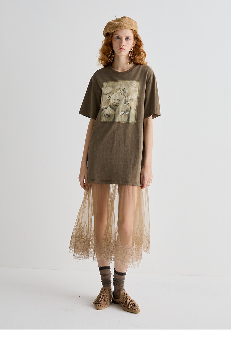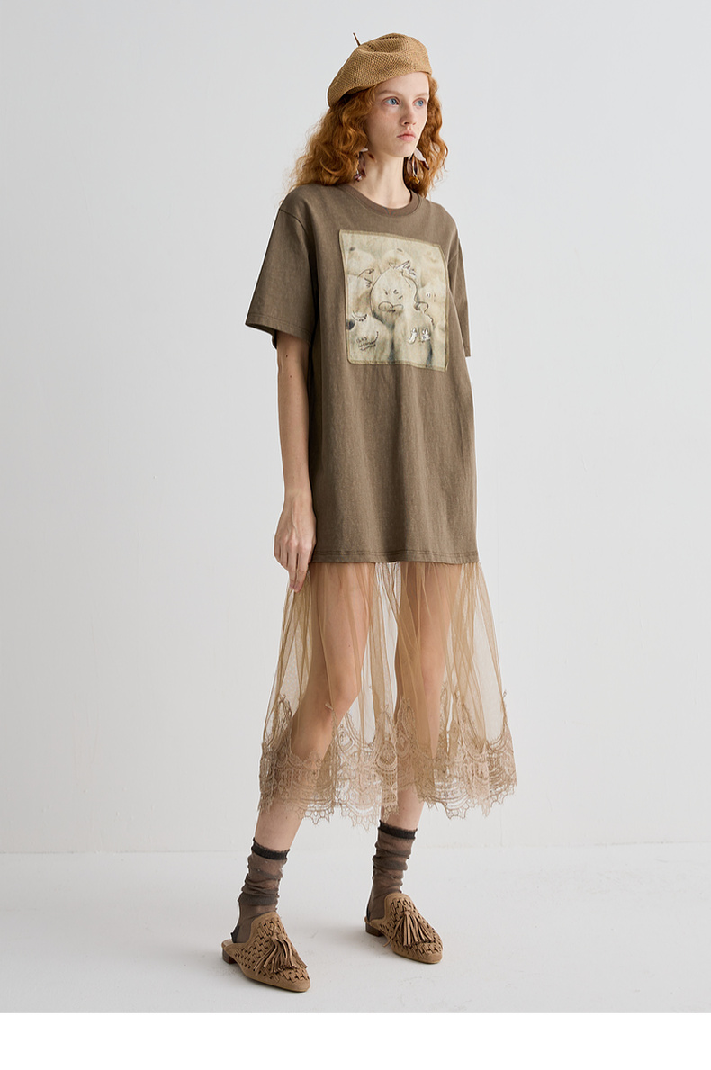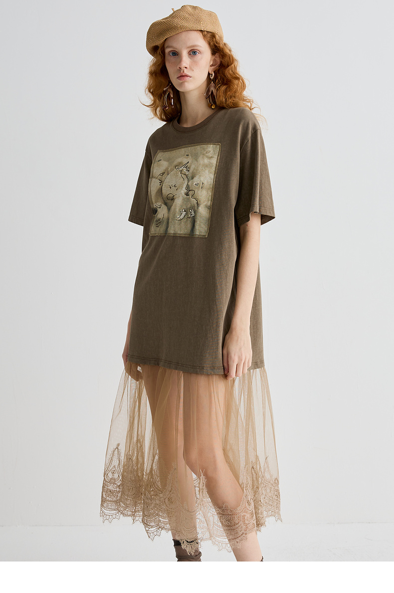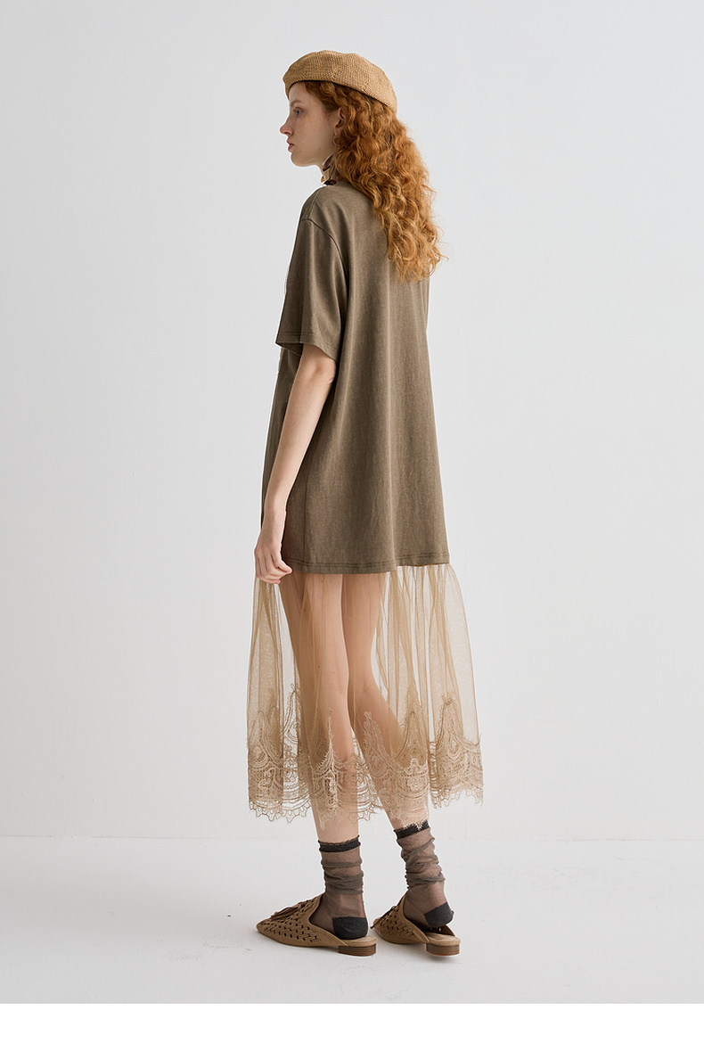 谜底连衣裙短袖女2025夏季新品休闲度假拼接宽松H型长裙252ML0614