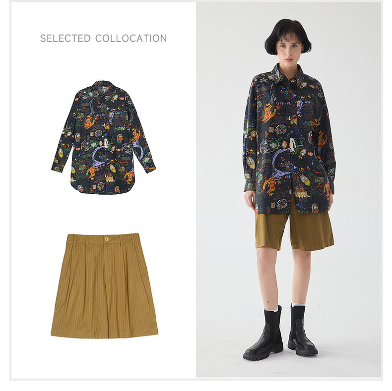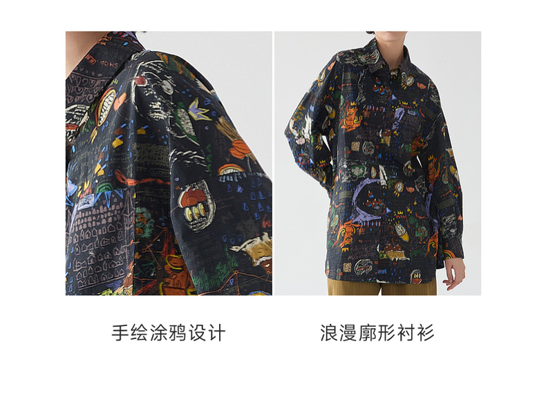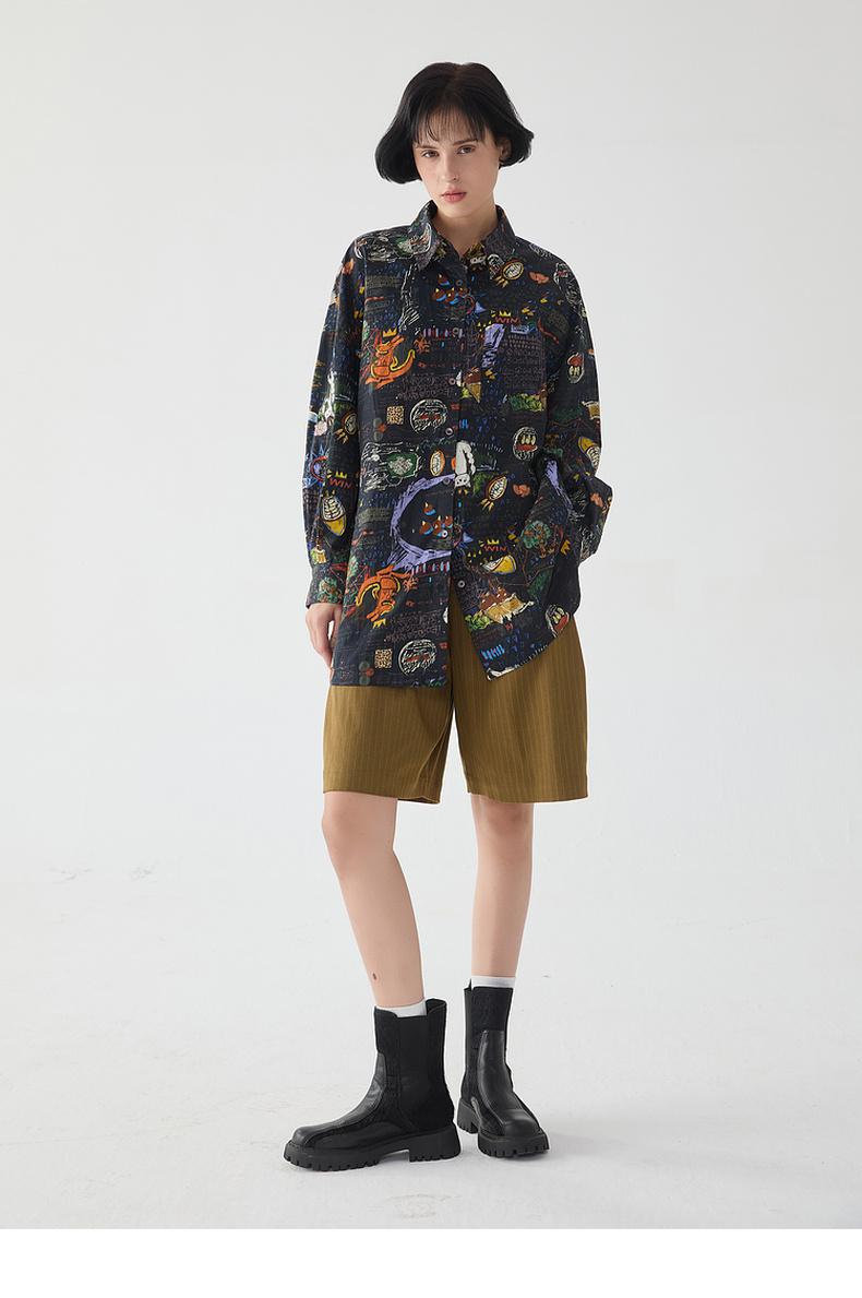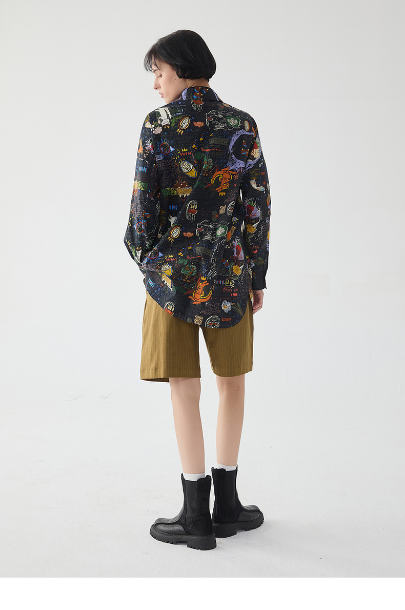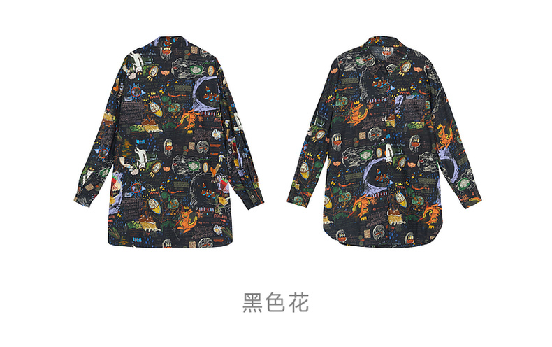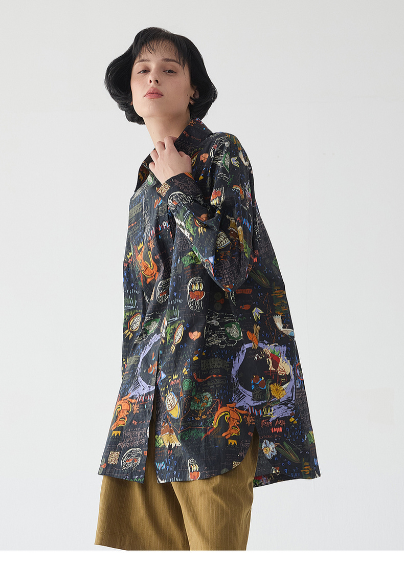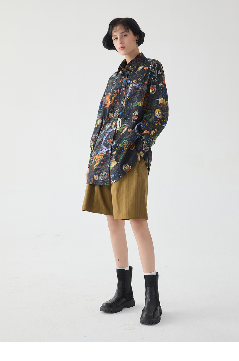 谜底大廓形衬衫长袖女2025春新款复古风花色中长款衬衣255MC3014