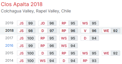 蓝宝堂是智利第2款满分酒,也是满分醉多的一个,连续4年三次获得满分(2014、2015和2017年),还有一次99分,其它年份萨克林评分也非常高。
