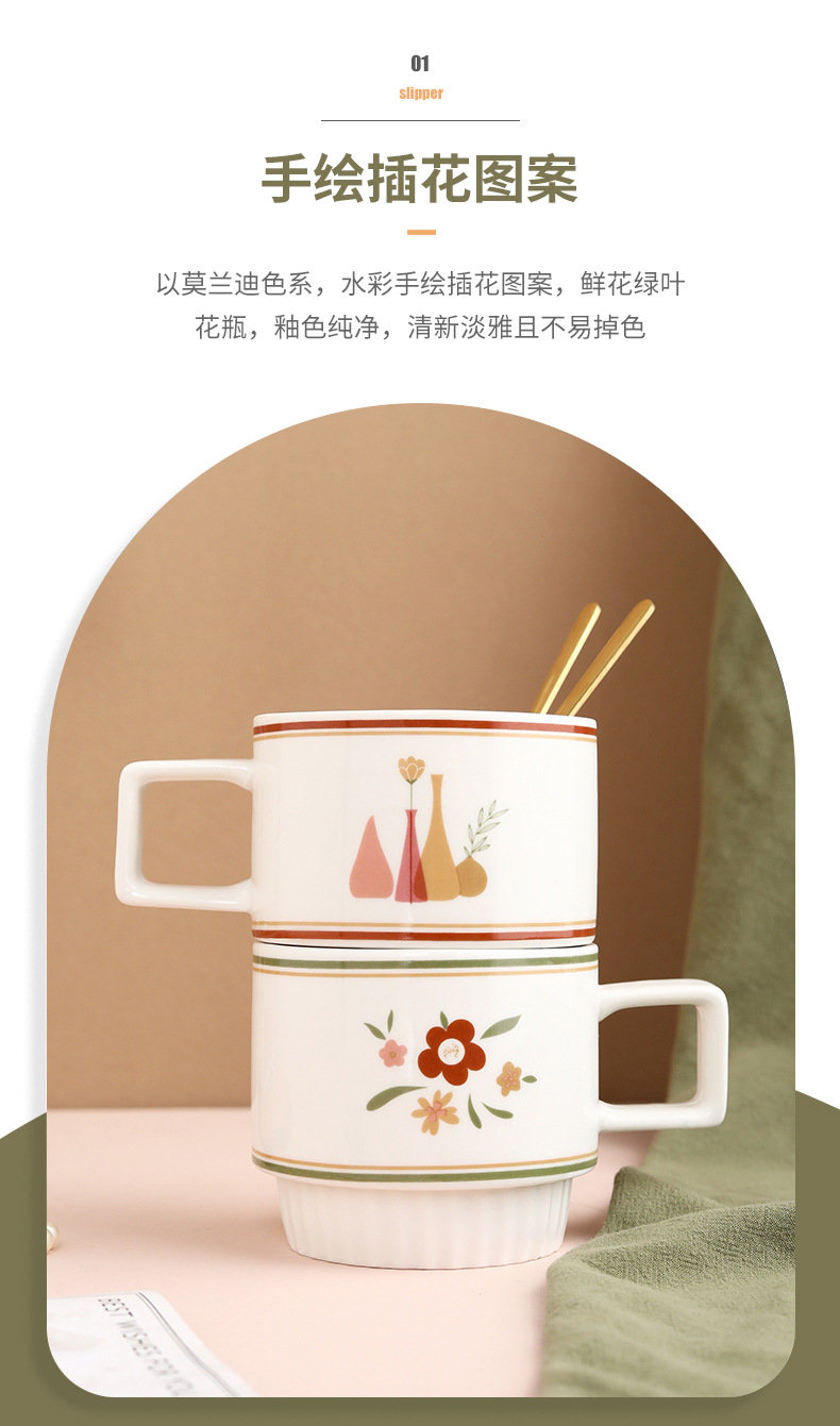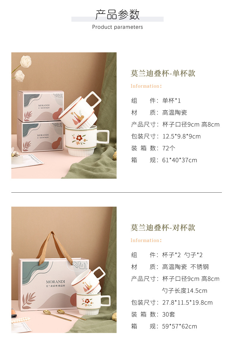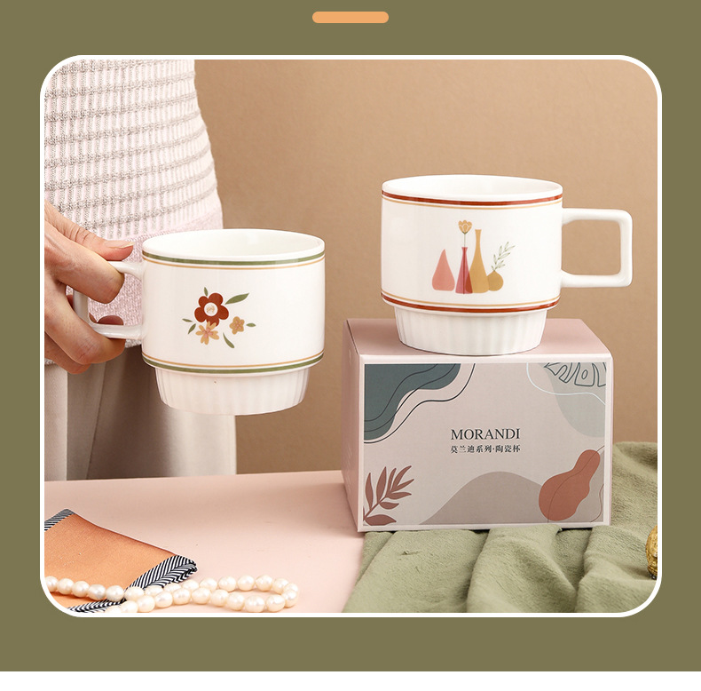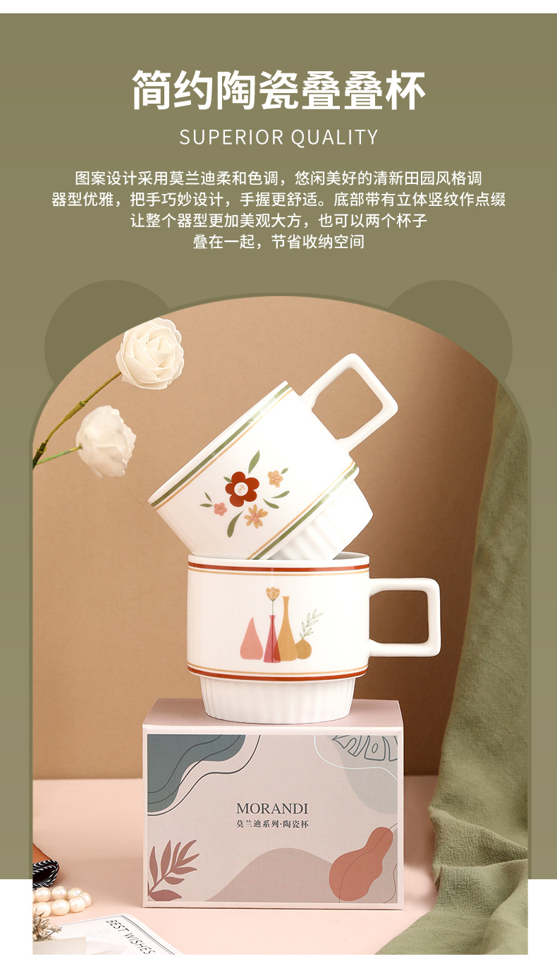 【简约风格!礼盒包装】ins高颜值莫兰迪叠叠杯陶瓷马克杯家用办公室咖啡杯礼盒装,图案设计采用莫兰迪柔和色调,悠闲美好的清新田园风格调 器型优雅,把手巧妙设计,手握更舒适。