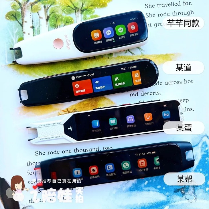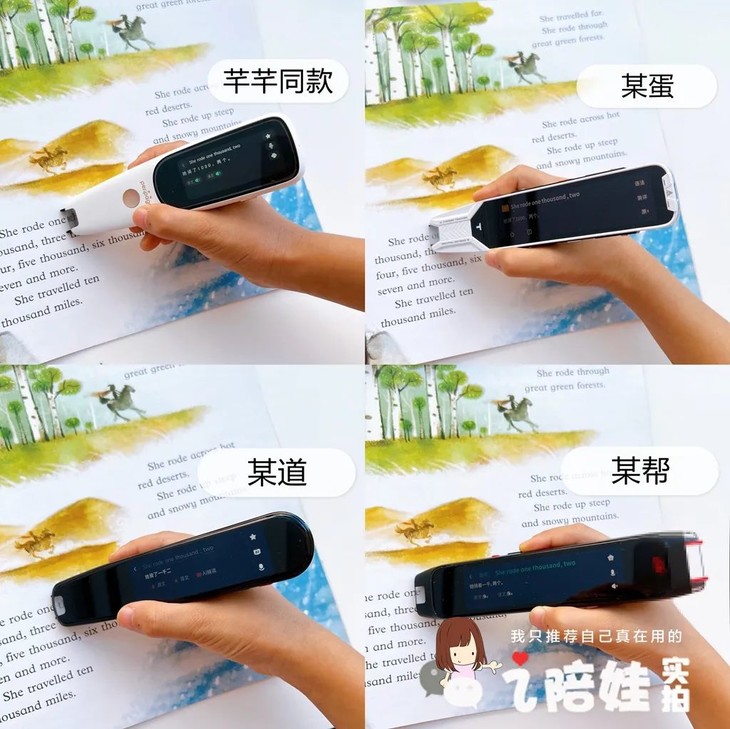 先是握感,某道偏商务、某蛋是有点棱角的太空舱造型、某帮偏长是双头设计(一边查词,一边扫题),爱立熊是相对更轻更小巧的(但相应屏幕略小了些,我个人可以接受,字体大小差距不大都能看清),孩子握着比较顺手。