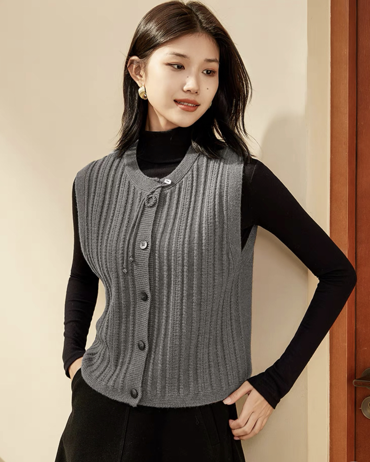 皮尔卡丹毛衫【100%绵羊毛】羊毛背心开衫女圆领绞花单排扣无袖针织马甲