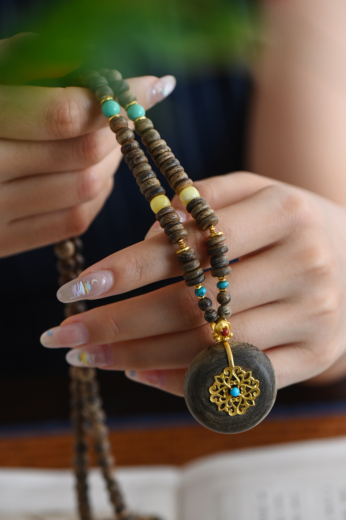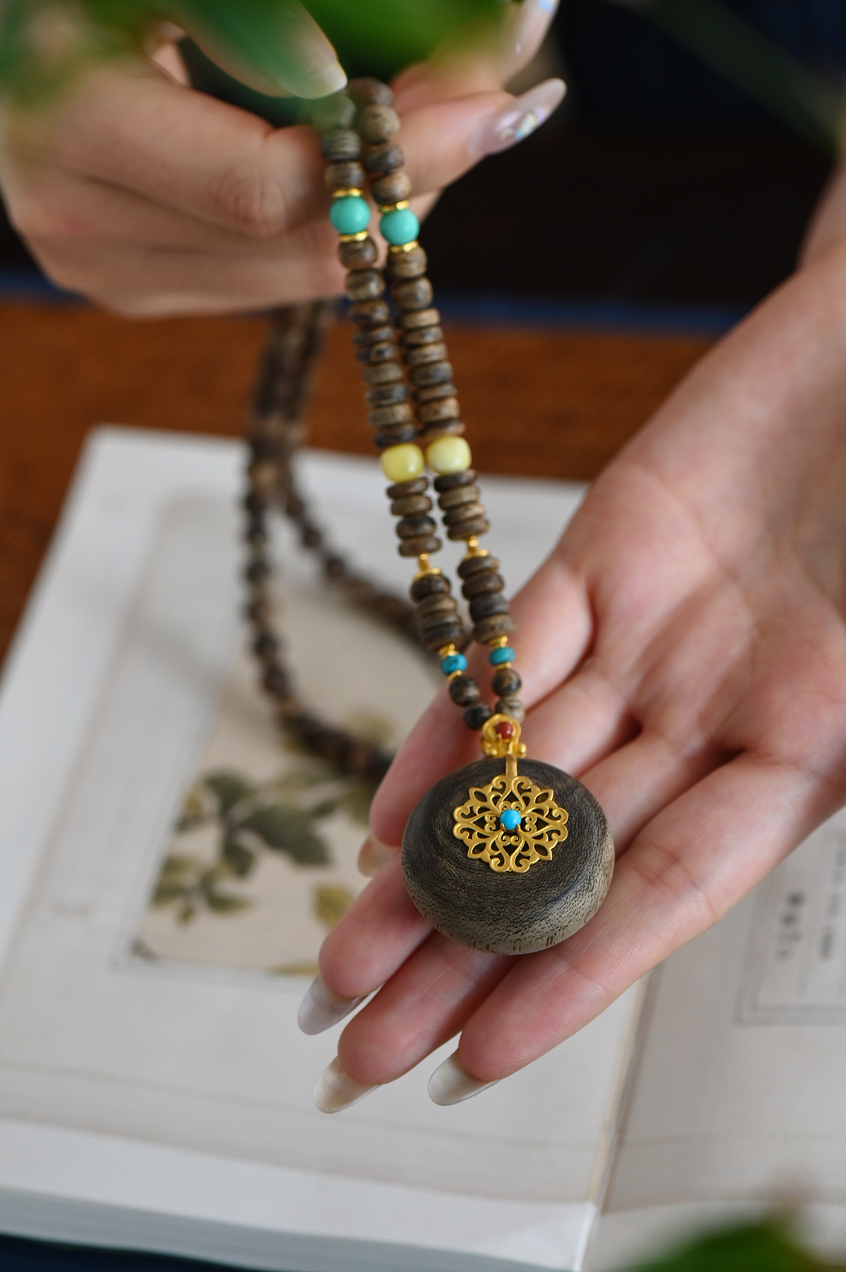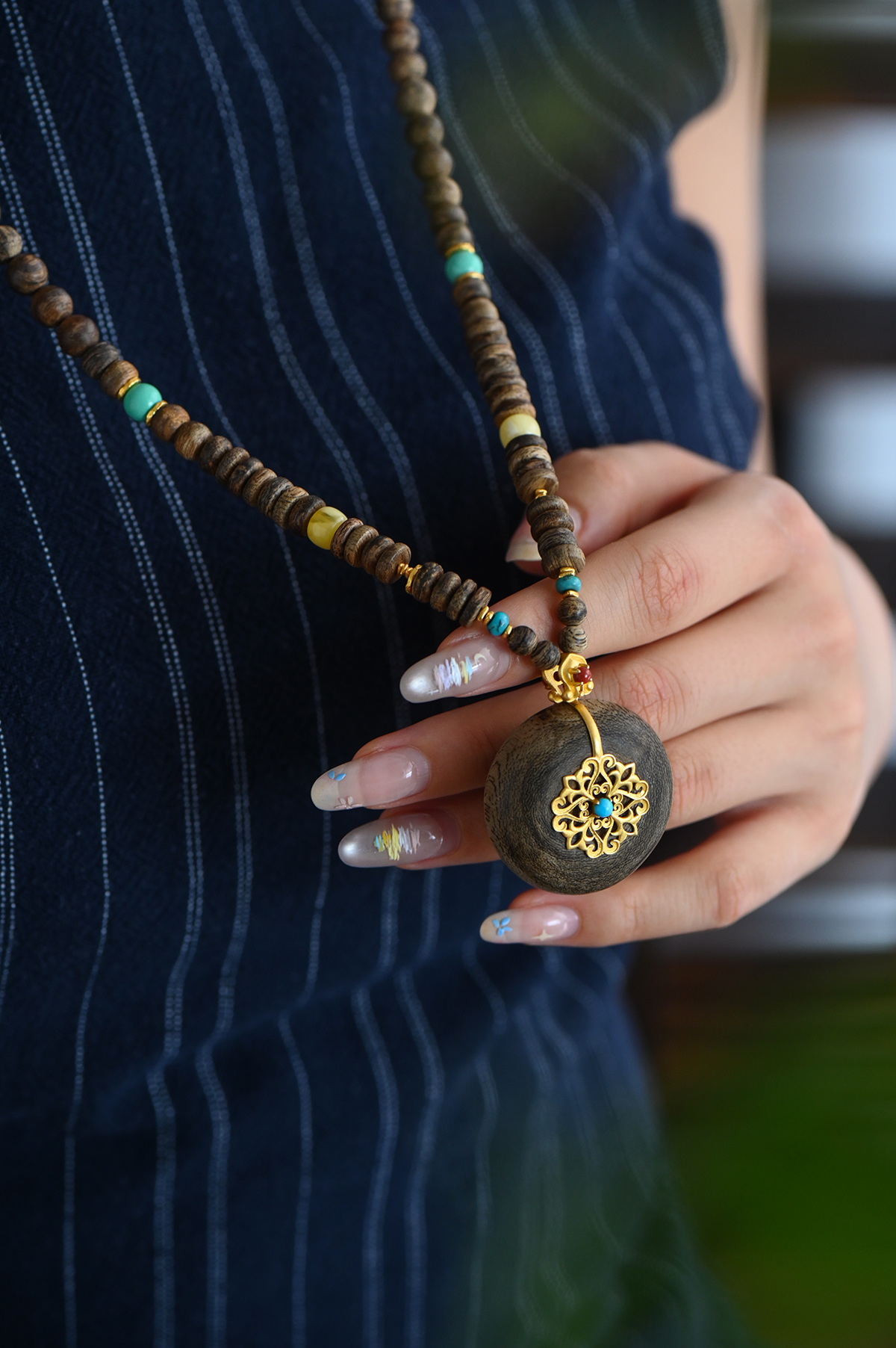 本款设计项链部分点缀了绿松石,让整个吊坠看起来更灵动,活泼。整体复古大气。