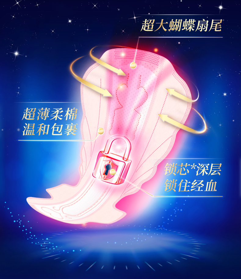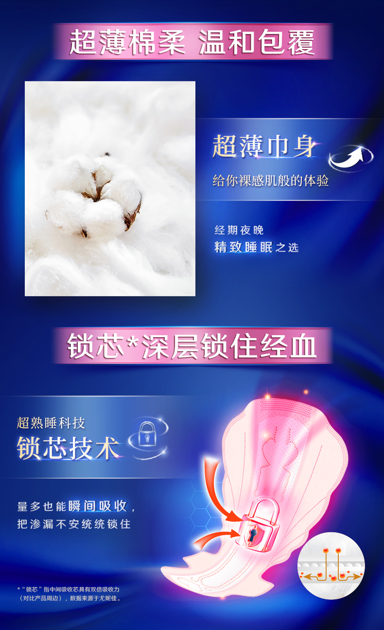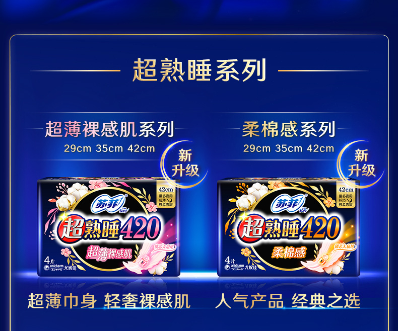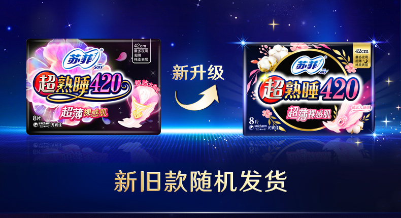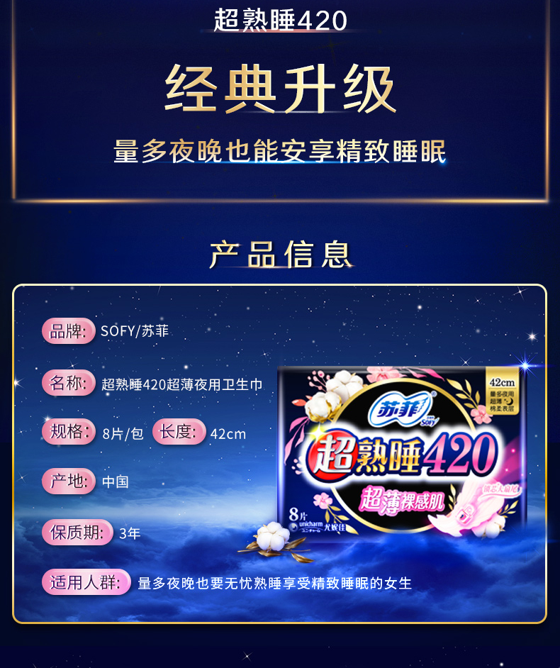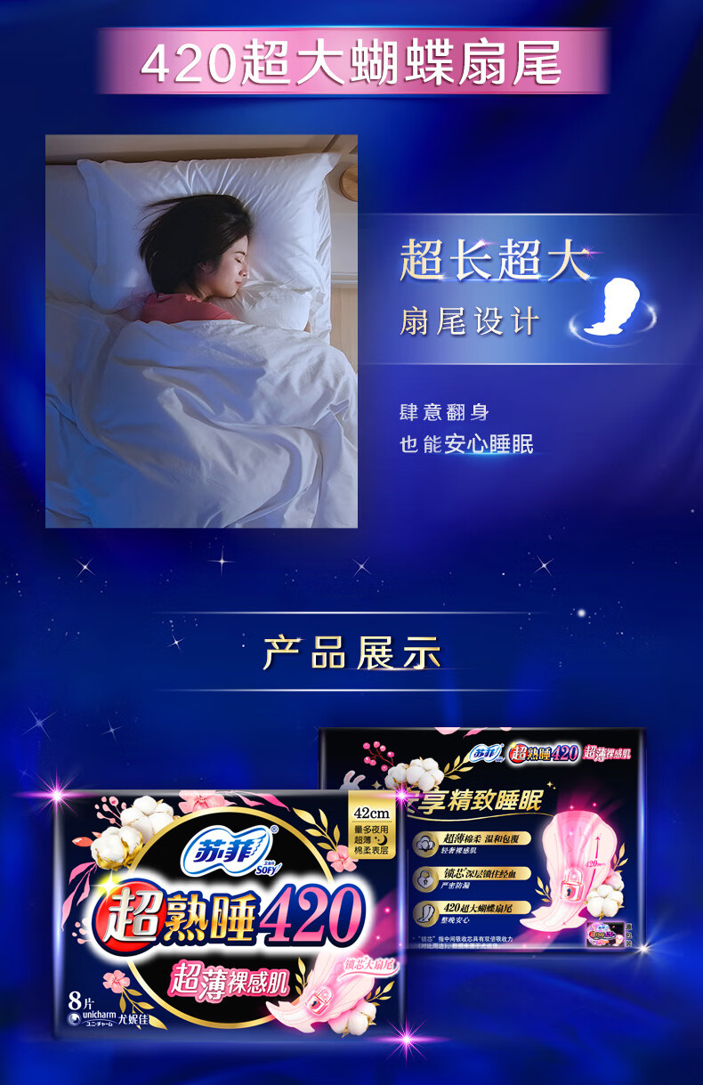 苏菲超熟睡超薄裸感肌超长夜用卫生巾420mm 8片超大扇尾姨妈巾