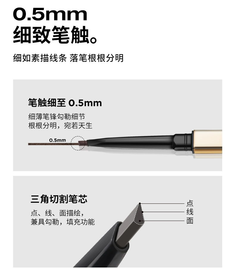 ❶笔芯旋出1mm,斜切面贴眉骨勾轮廓