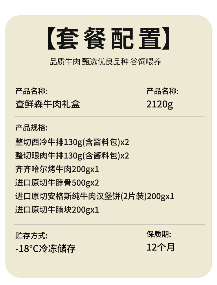 查鲜森 牛肉礼盒398型 2120g【实物/礼券】