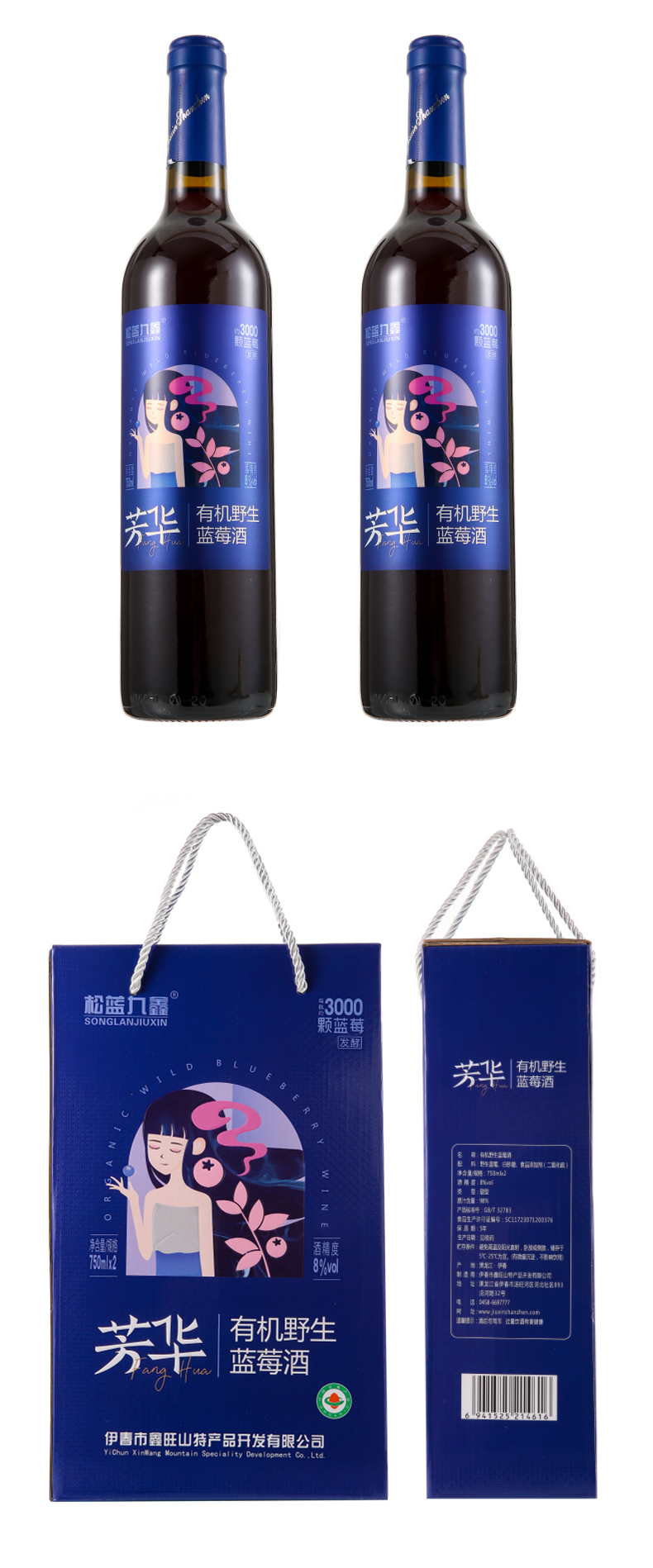 芳华有机野生蓝莓果酒750ml*2双支礼盒