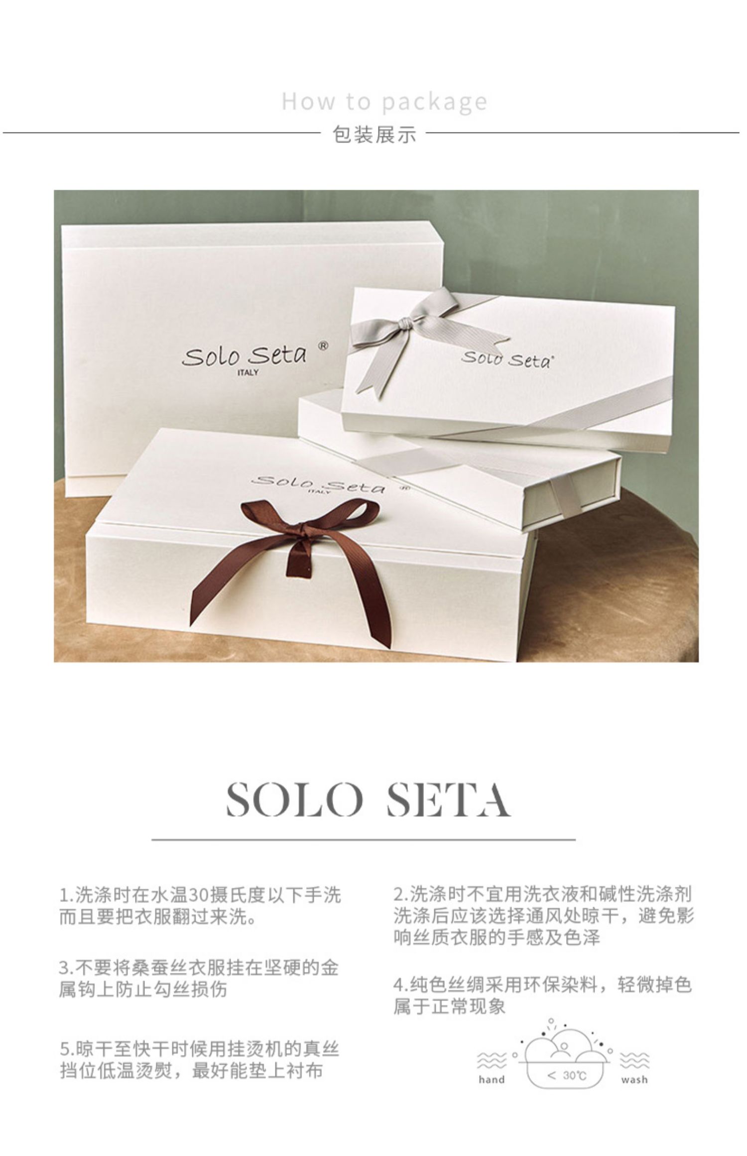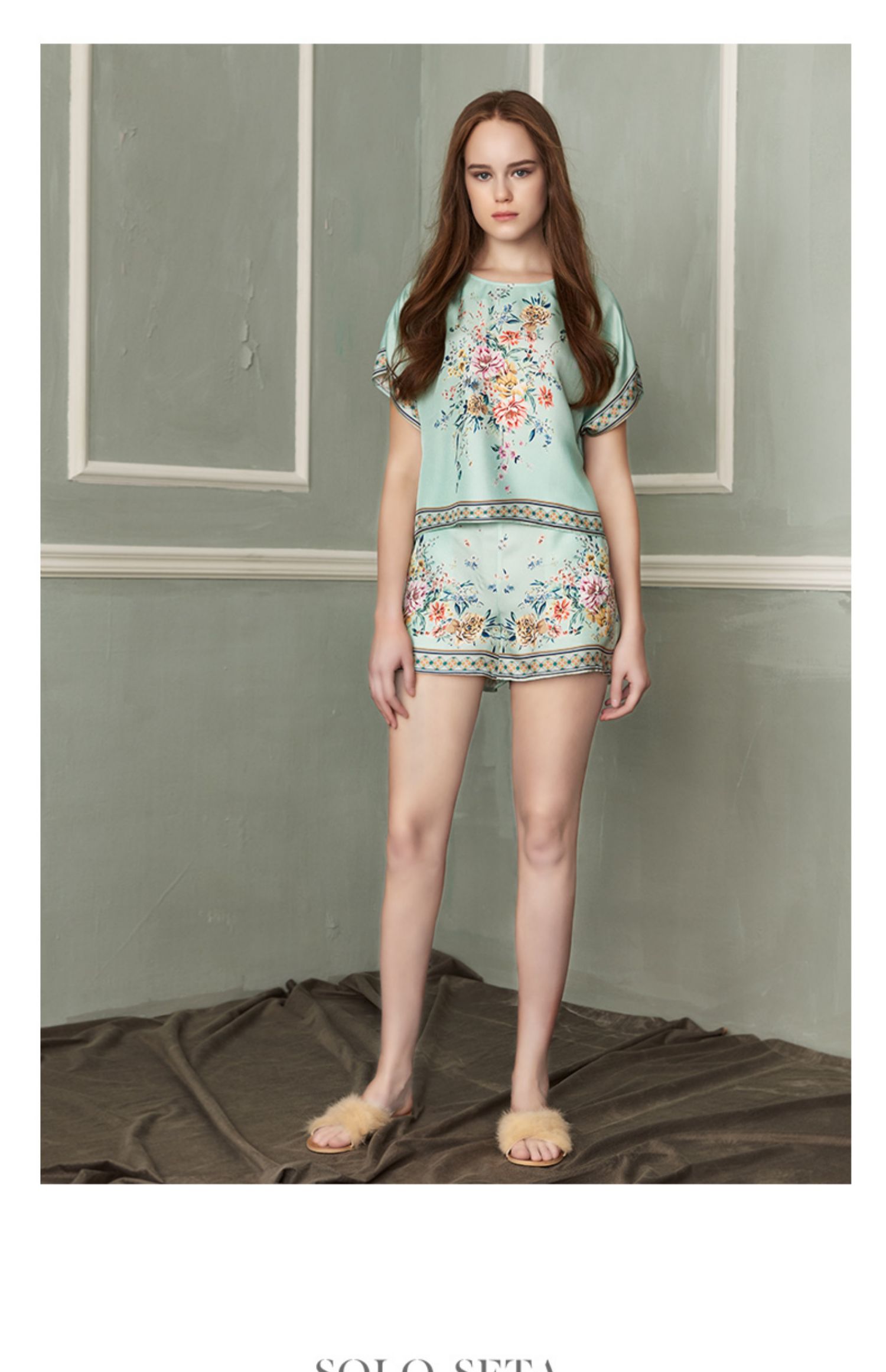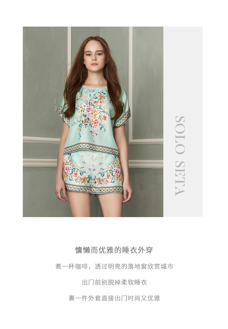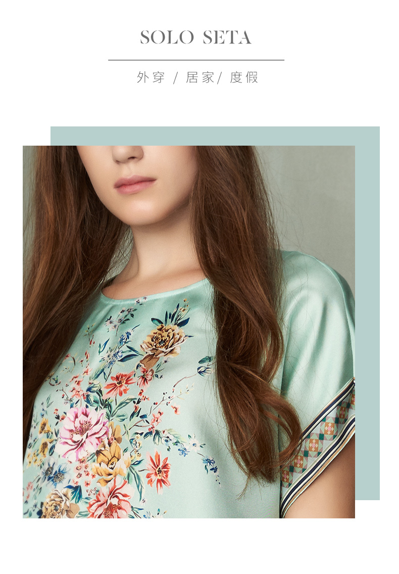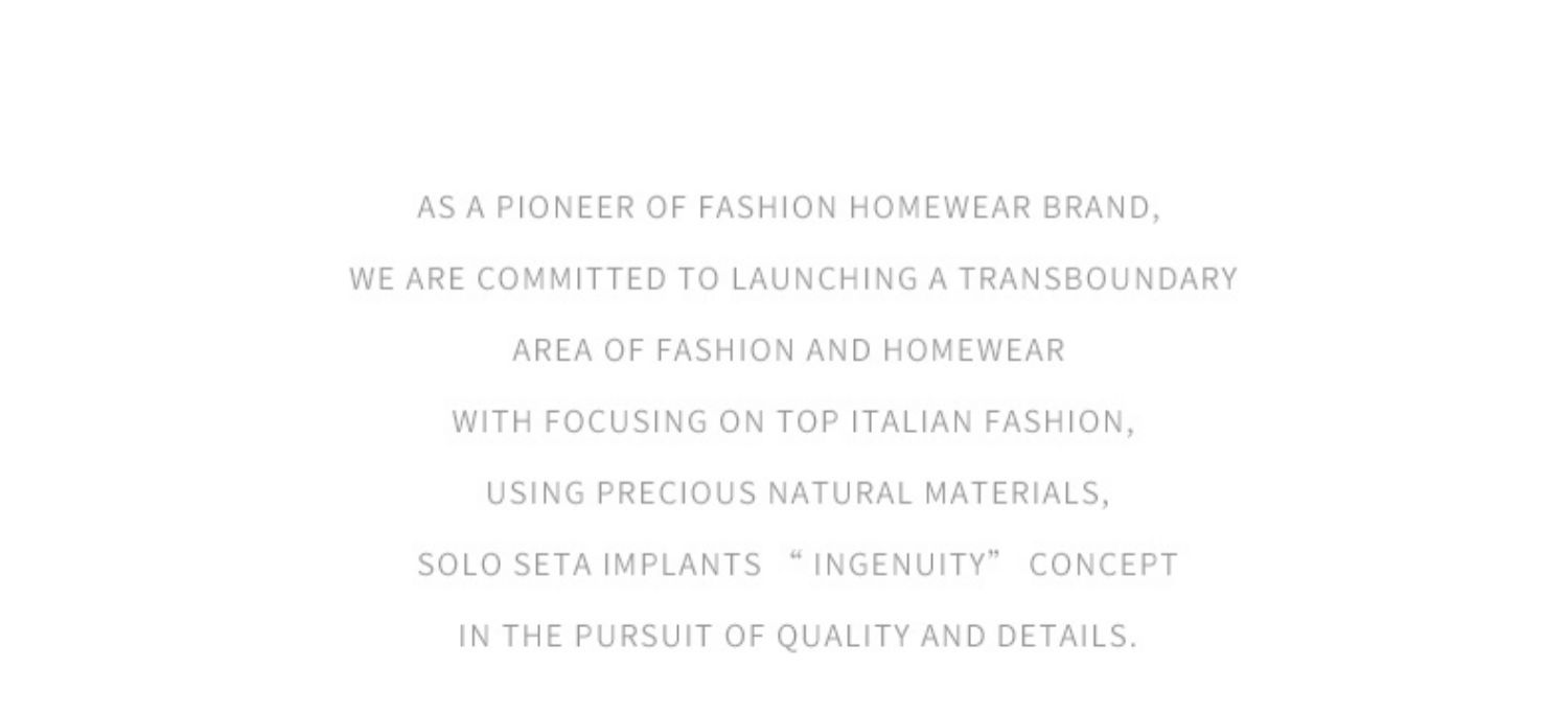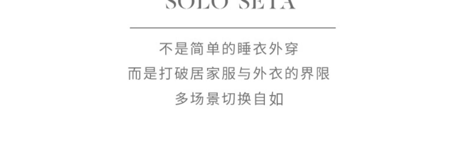 - soloseta专注于真丝织物,灵感源自意大利语,中文含义为“只做真丝”的意思。让睡衣变时尚,居家和外出瞬间切换,使其更具有出街,度假,参加宴会等功能。