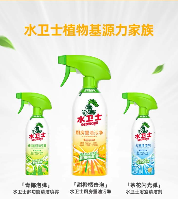 【清洁套装】水卫士 家庭清洁全家福(洗衣机槽清洁剂*3袋+重油污净*2瓶送1个喷头+校服净*1瓶+洁厕净*1瓶+家居除菌液*1瓶)