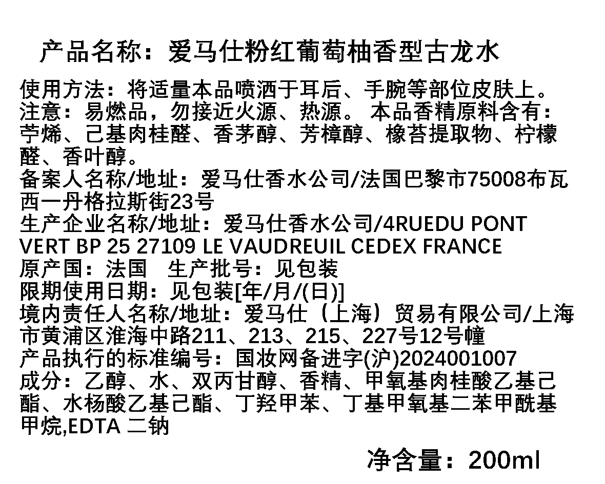 Hermes爱马仕 葡萄柚玫瑰/粉红葡萄柚香水