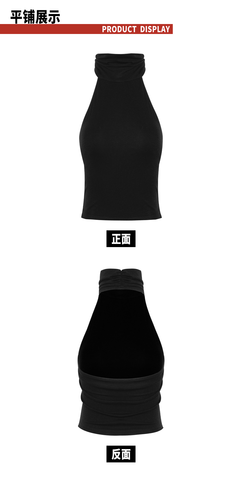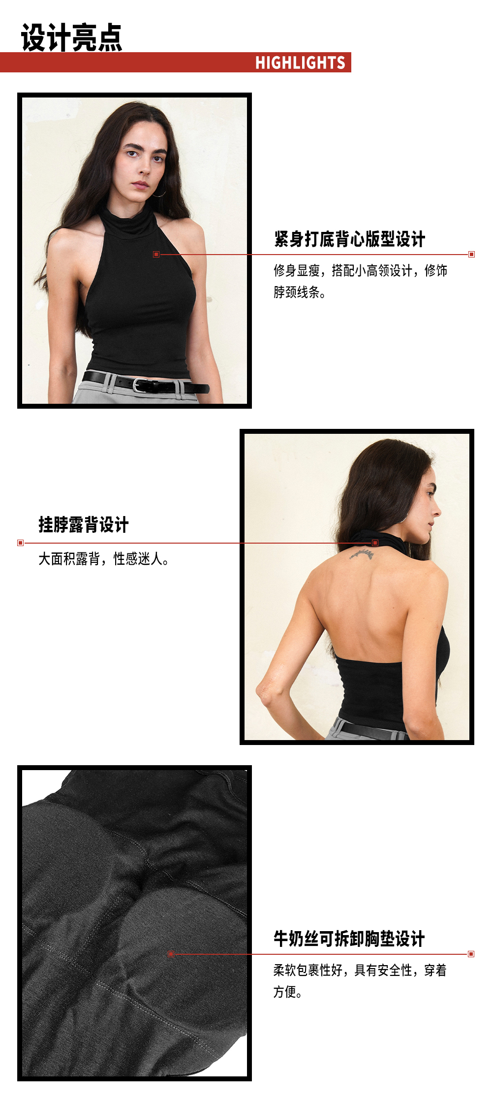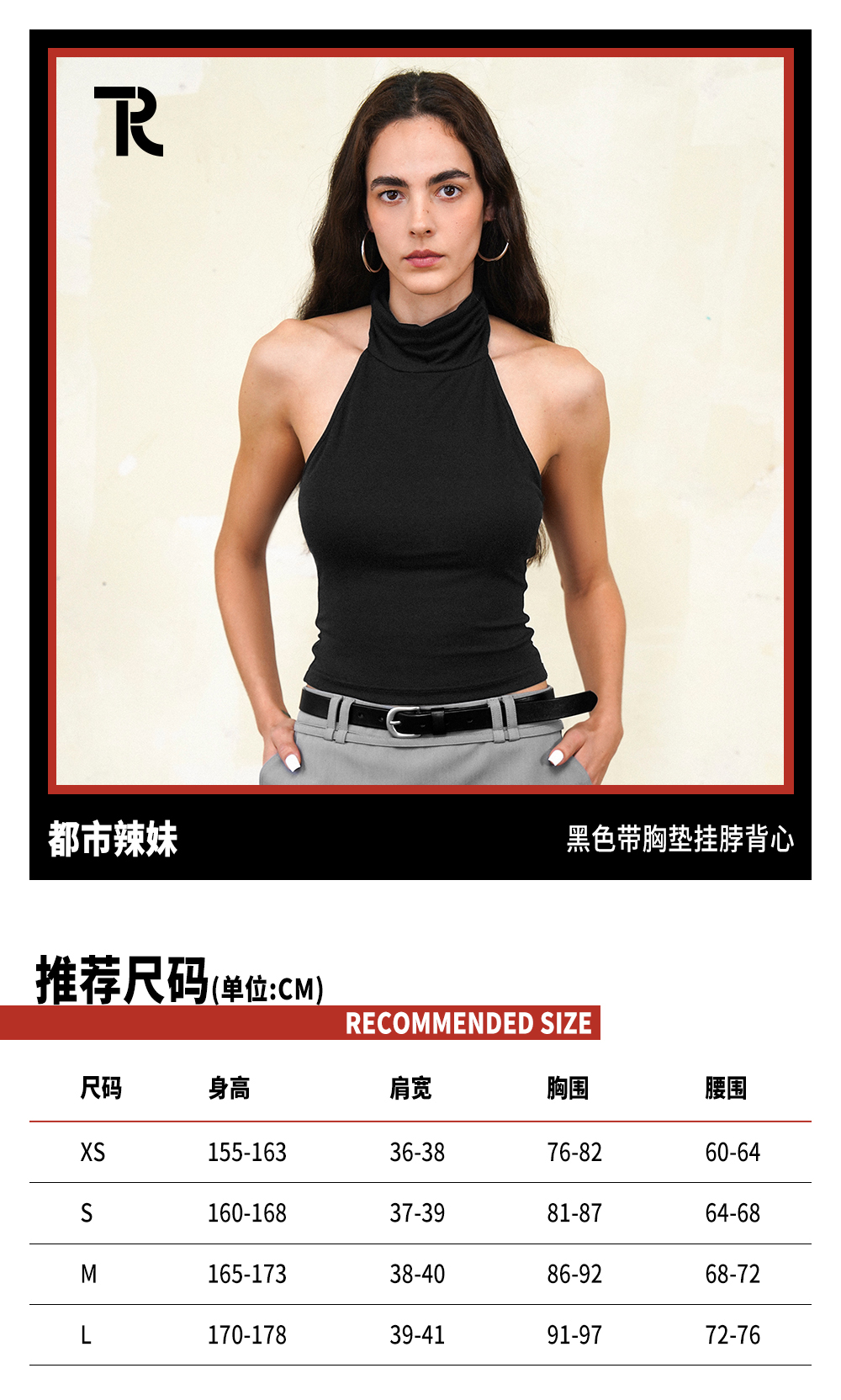 TR她热 都市辣妹 黑色冰丝凉感露背性感带胸垫挂脖吊带背心