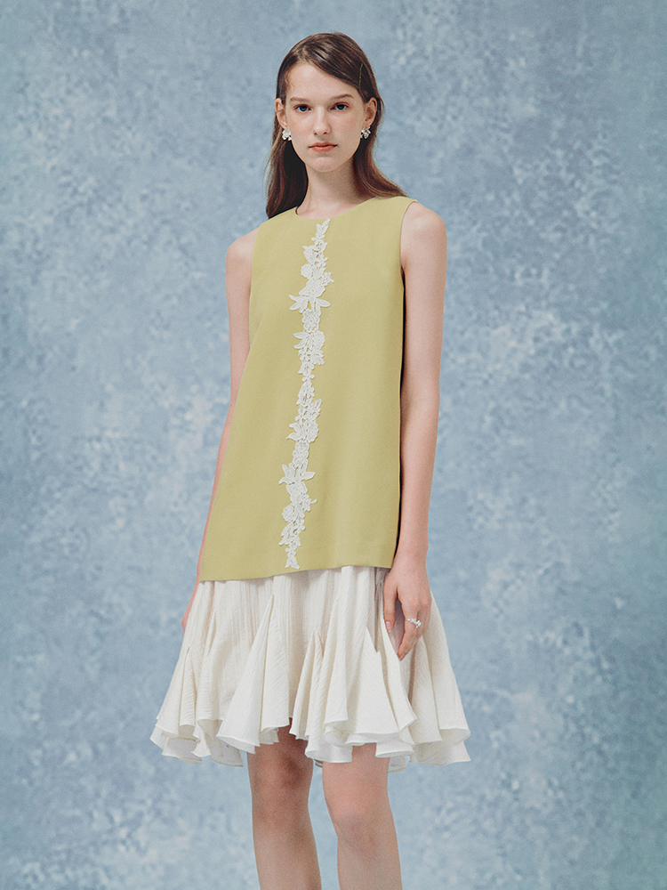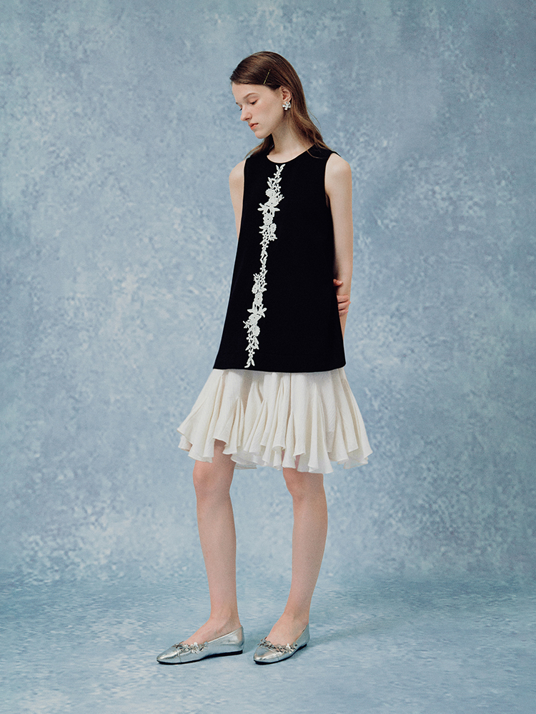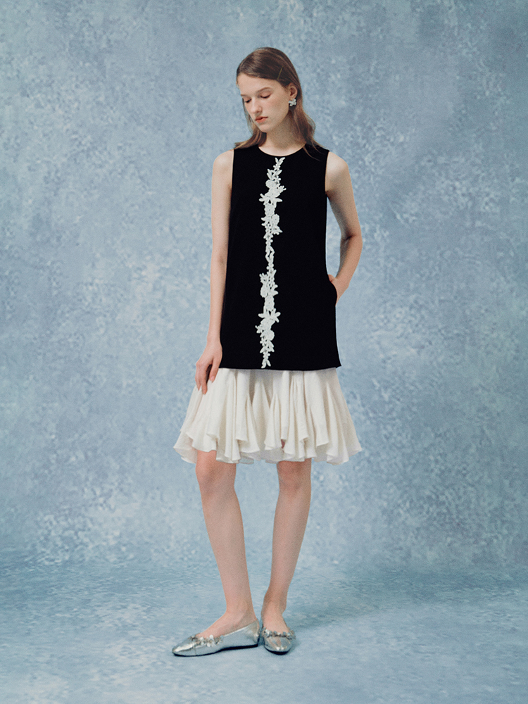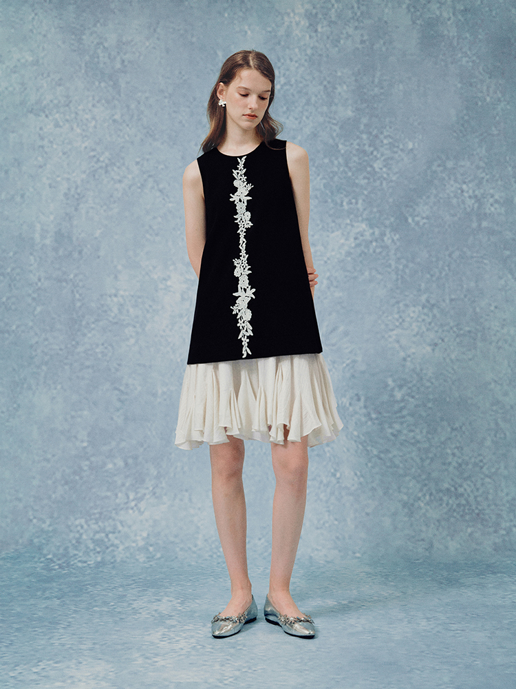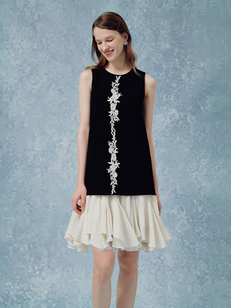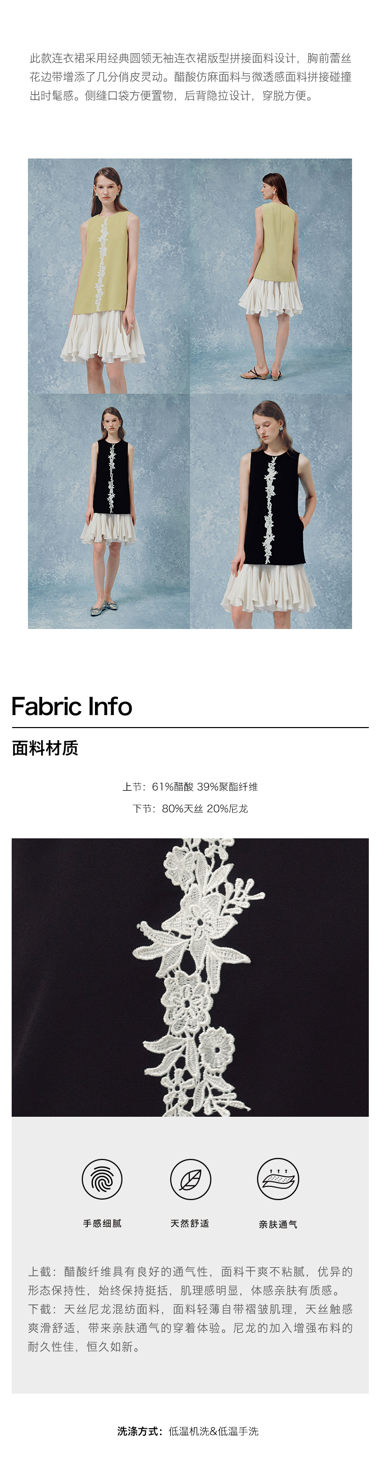 ForPoem 现货 25/SS原创设计蕾丝花边醋酸拼接不规则下摆短款连衣裙