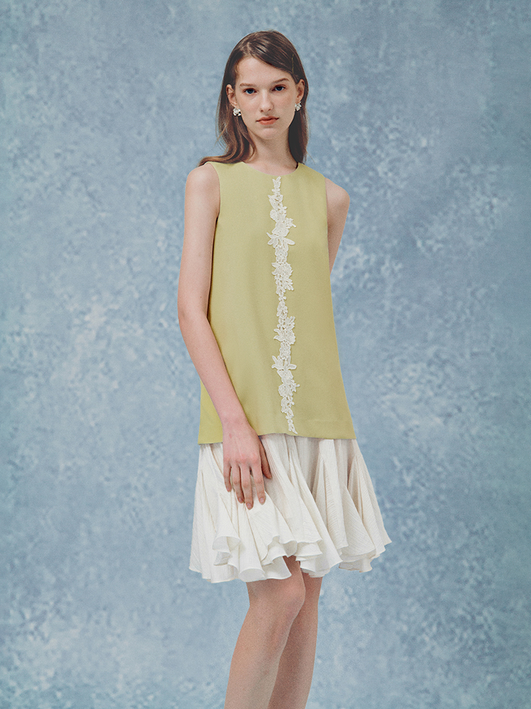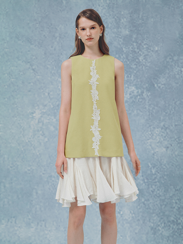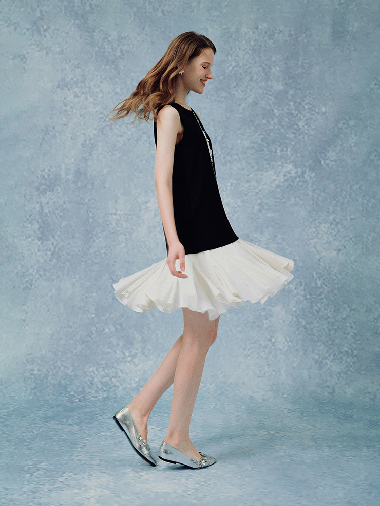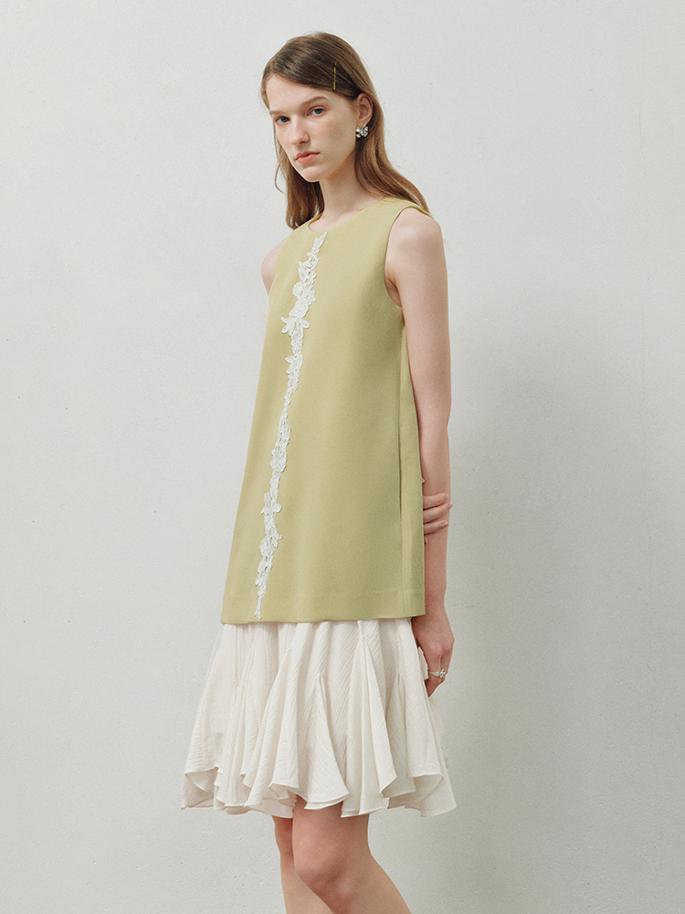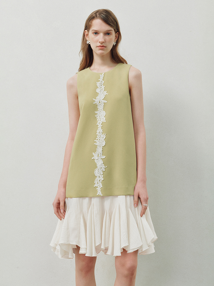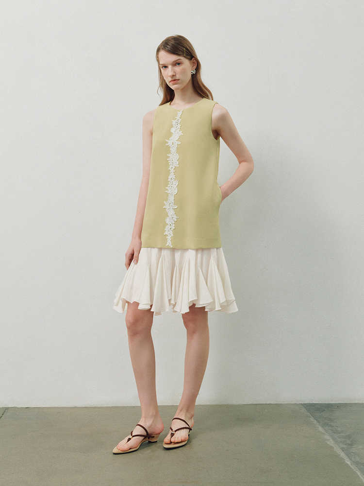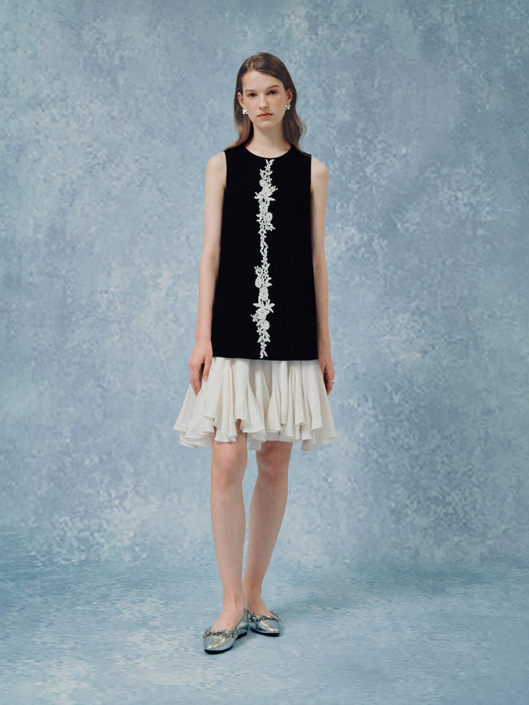 ForPoem 现货 25/SS原创设计蕾丝花边醋酸拼接不规则下摆短款连衣裙