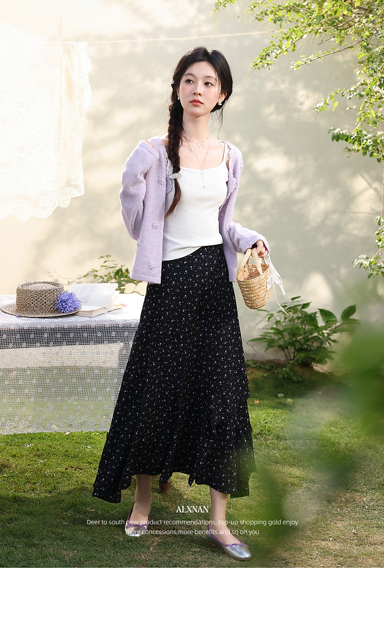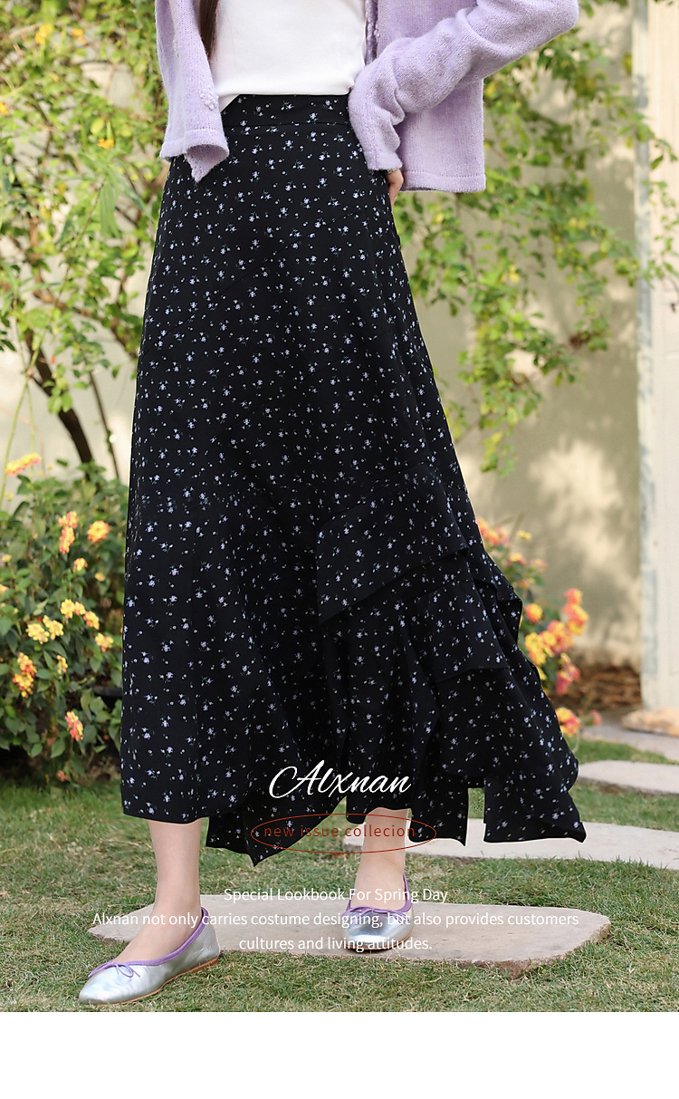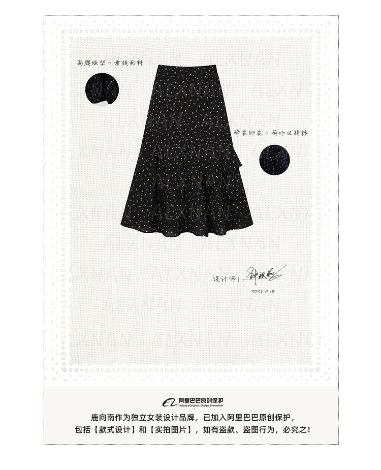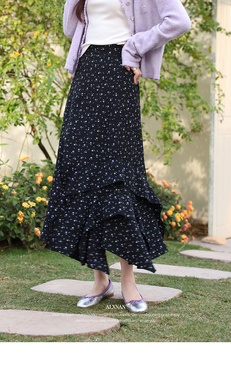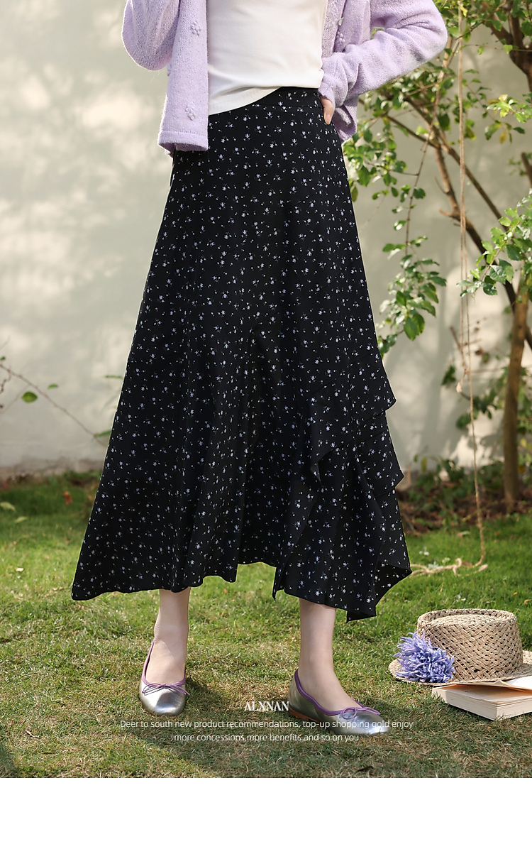 鹿向南「花影星踪」黑色碎花半身裙女春新款小个子高腰巨好看长裙