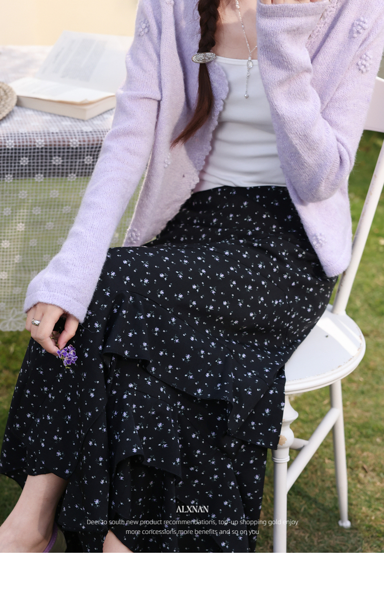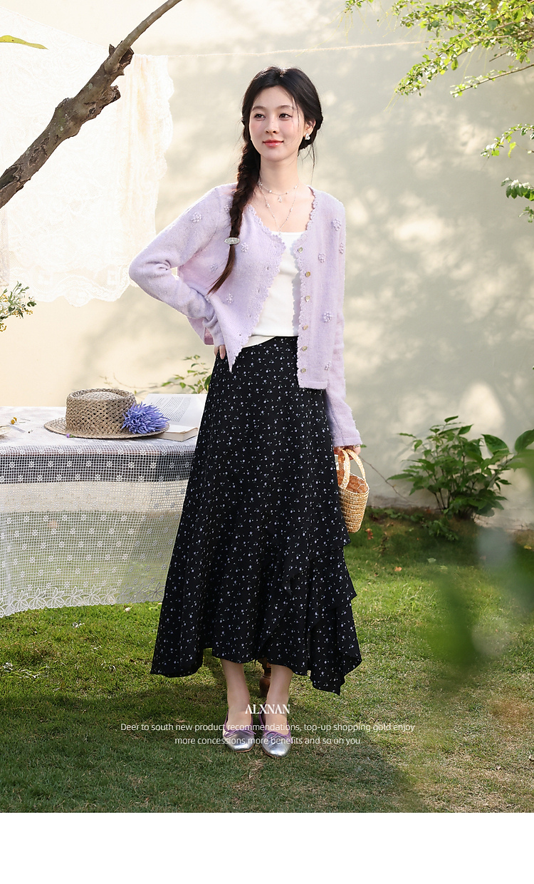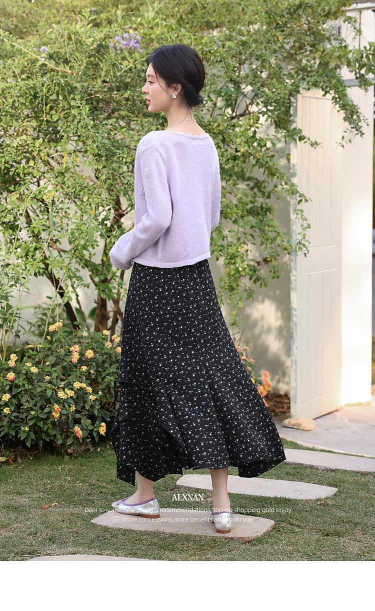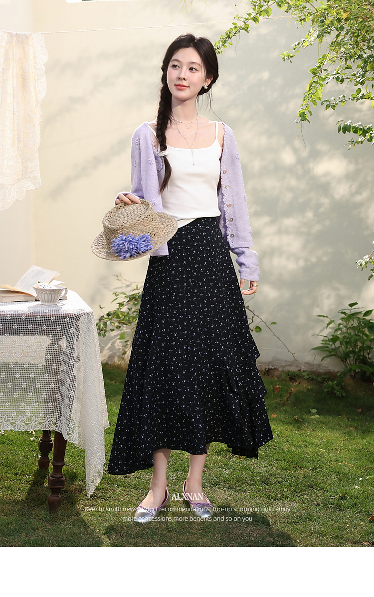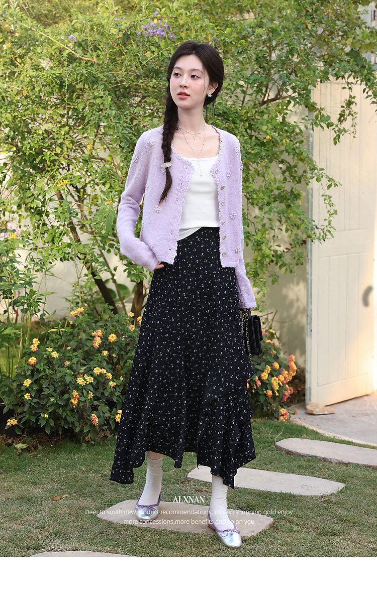 鹿向南「花影星踪」黑色碎花半身裙女春新款小个子高腰巨好看长裙