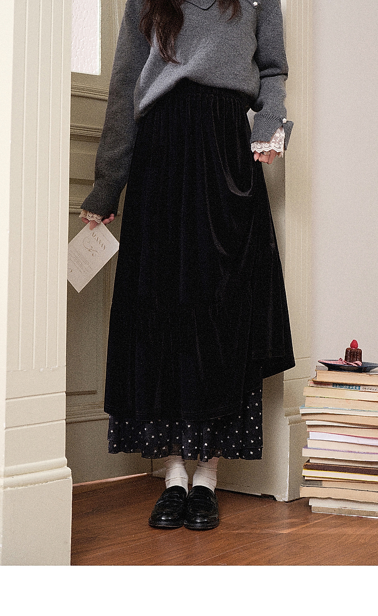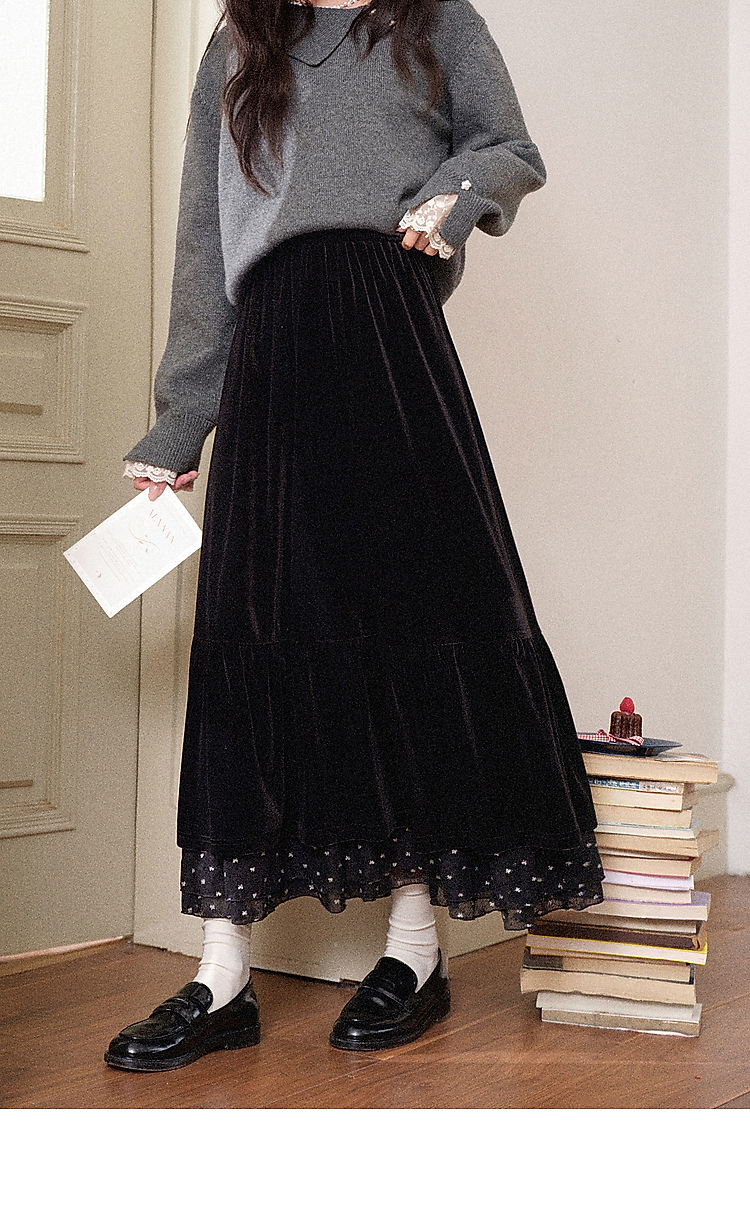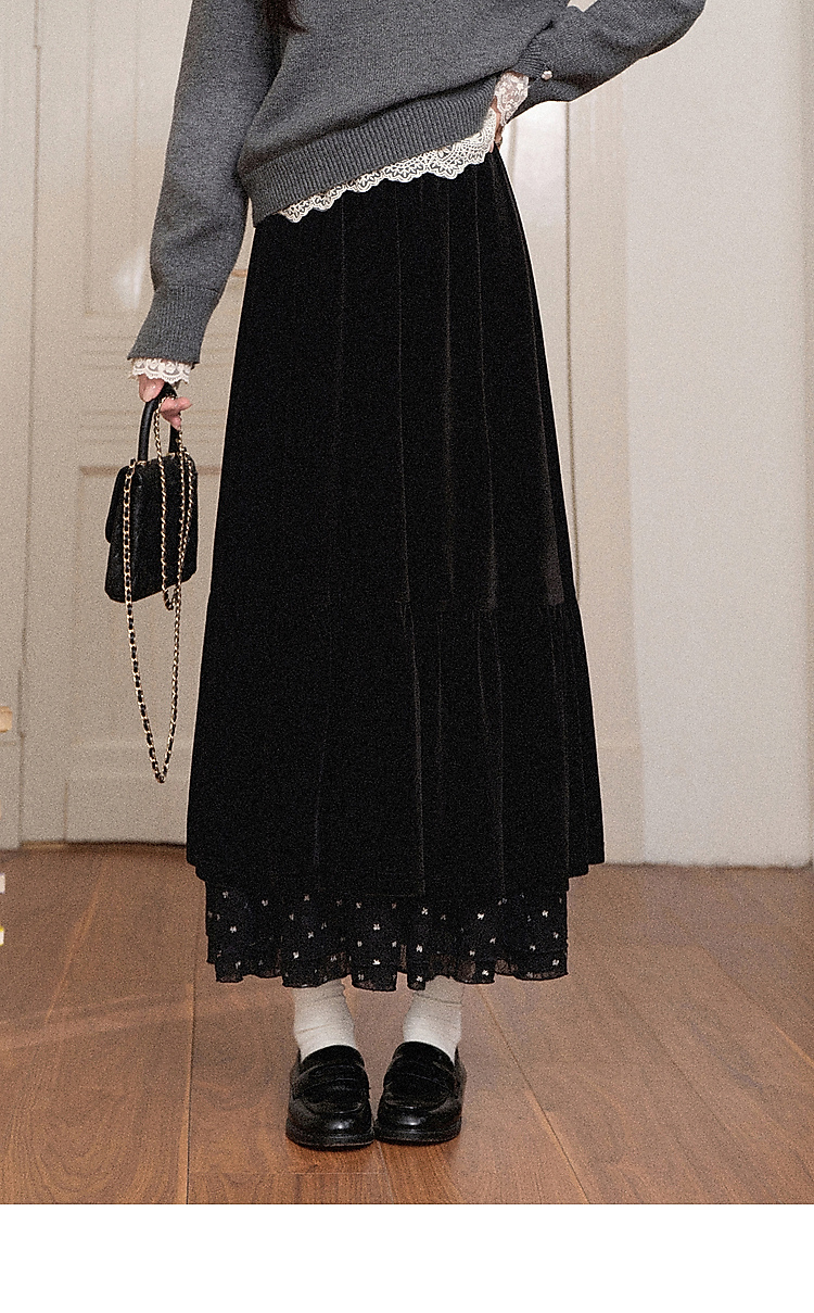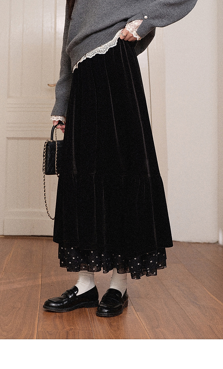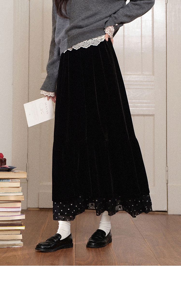 鹿向南「烁烁夜幕」黑色丝绒半身裙女拼接蕾丝冬季新款高腰A字裙