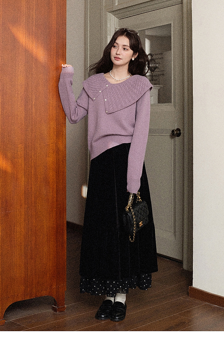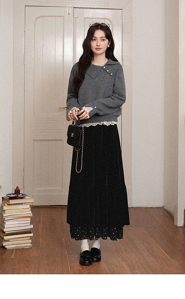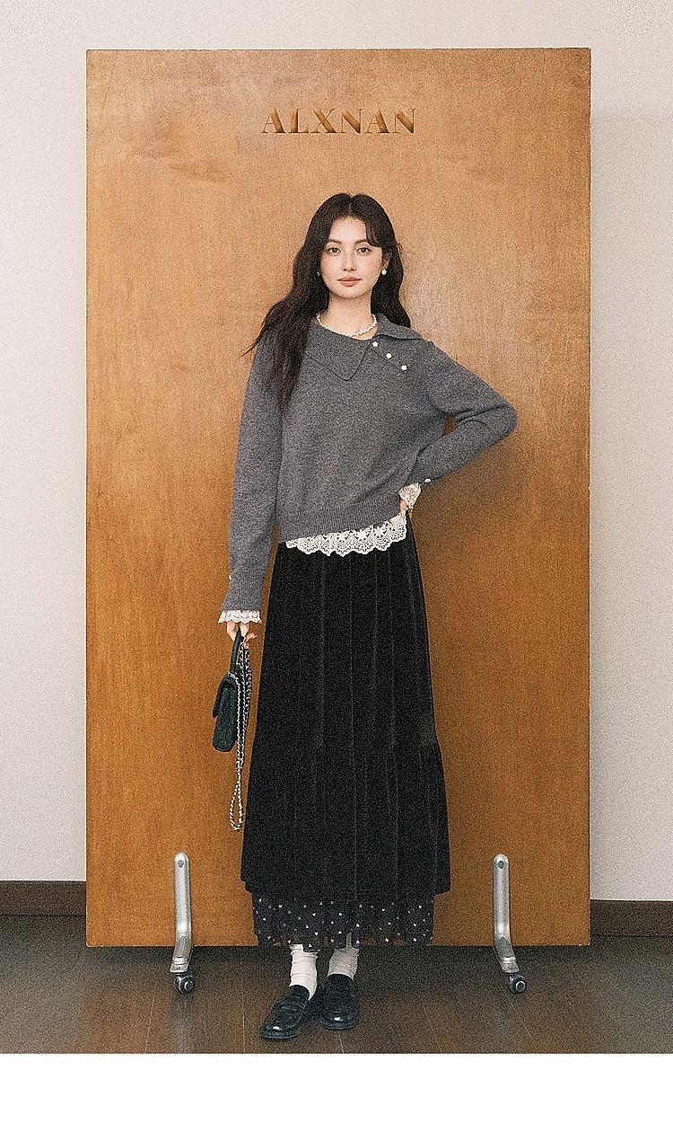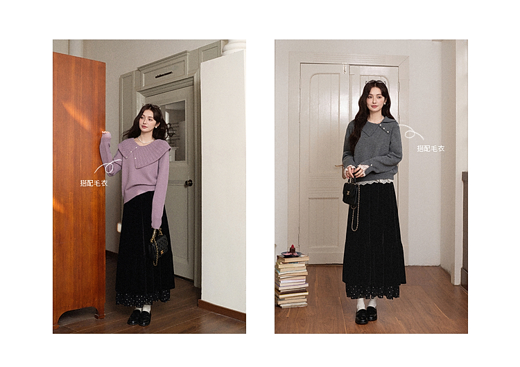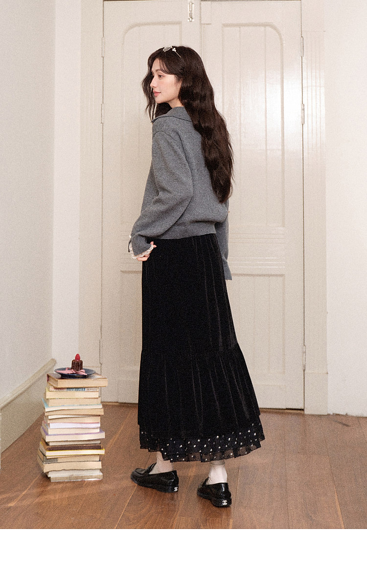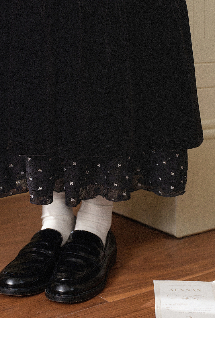 鹿向南「烁烁夜幕」黑色丝绒半身裙女拼接蕾丝冬季新款高腰A字裙