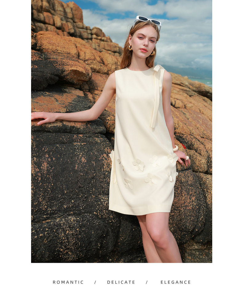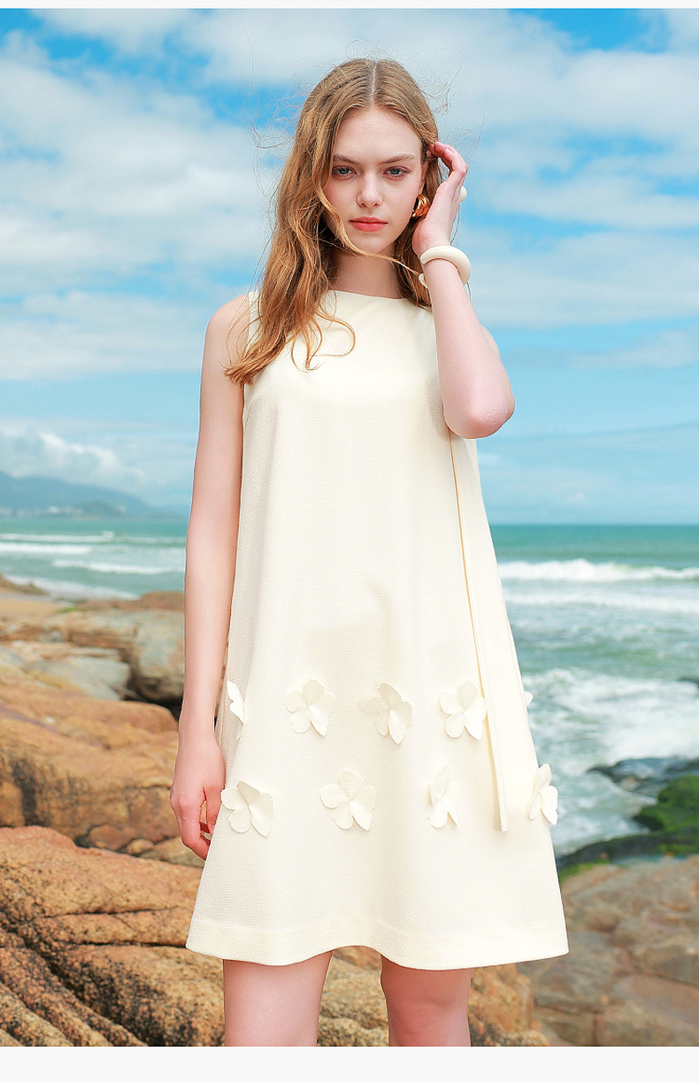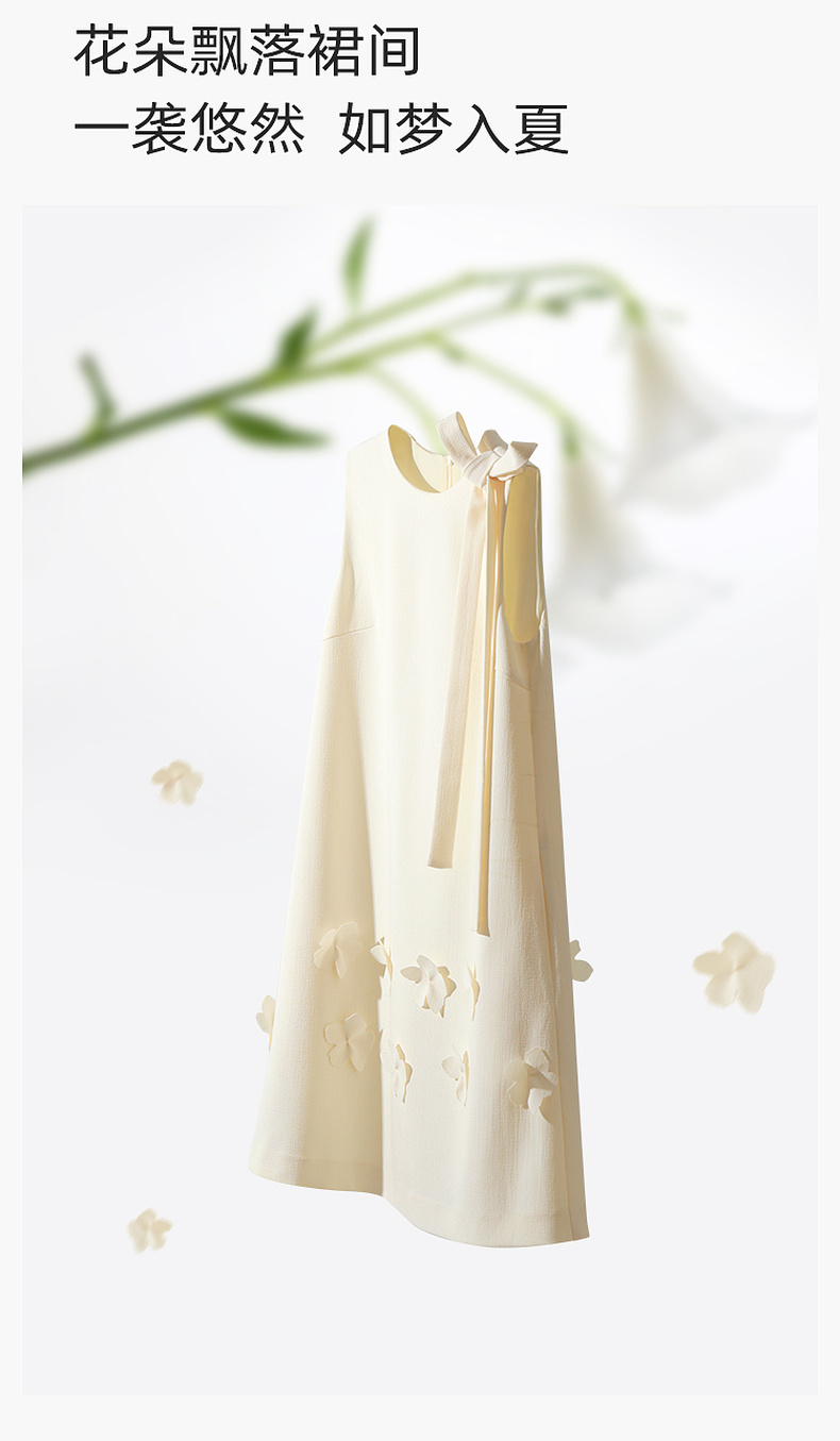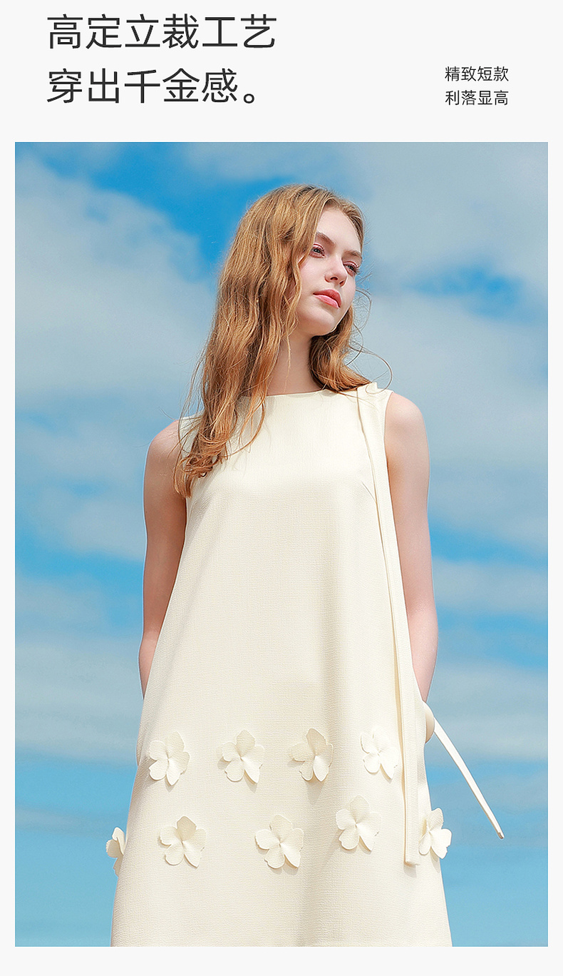 三彩2025夏季新款设计感飘带圆领连衣裙立体花朵无袖短裙M