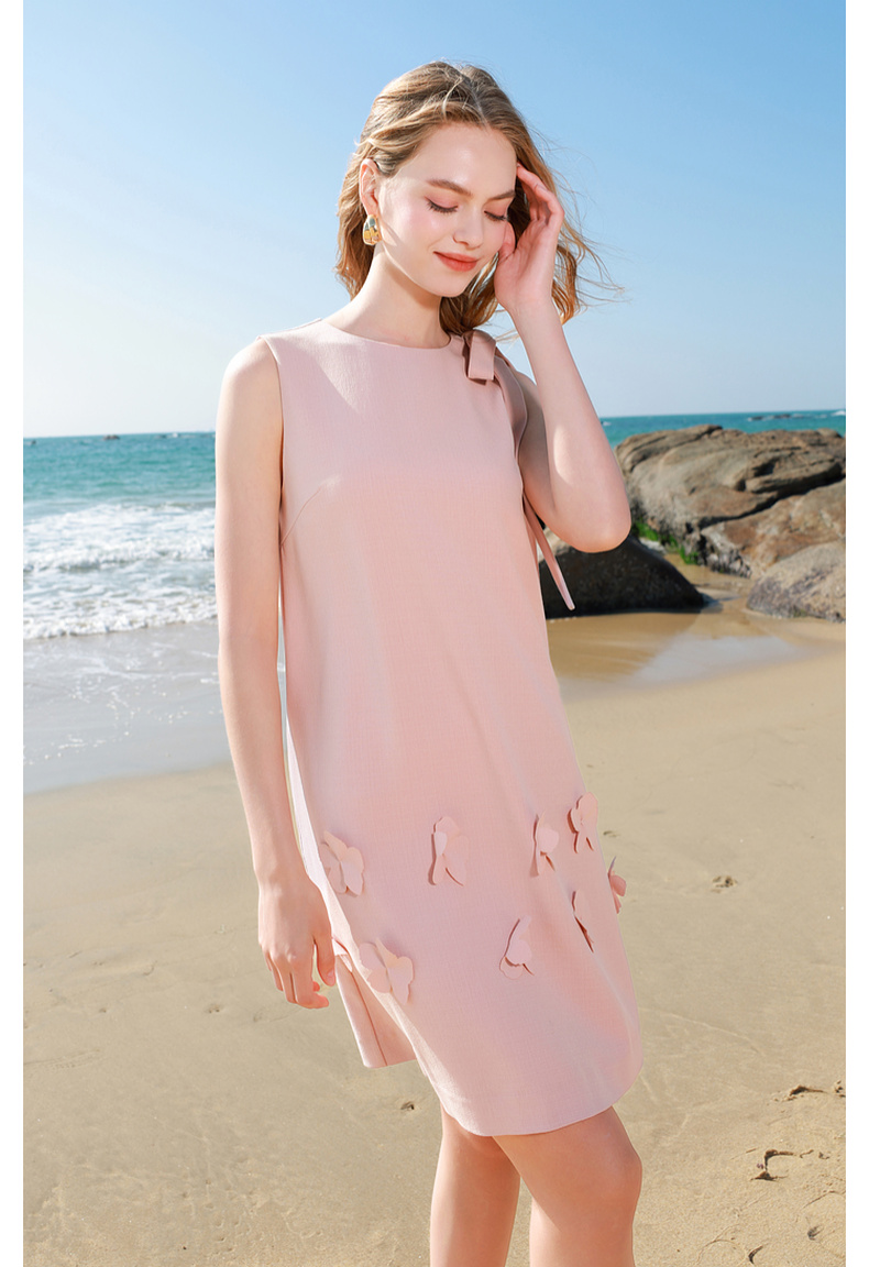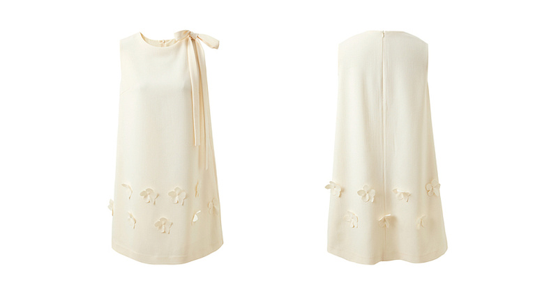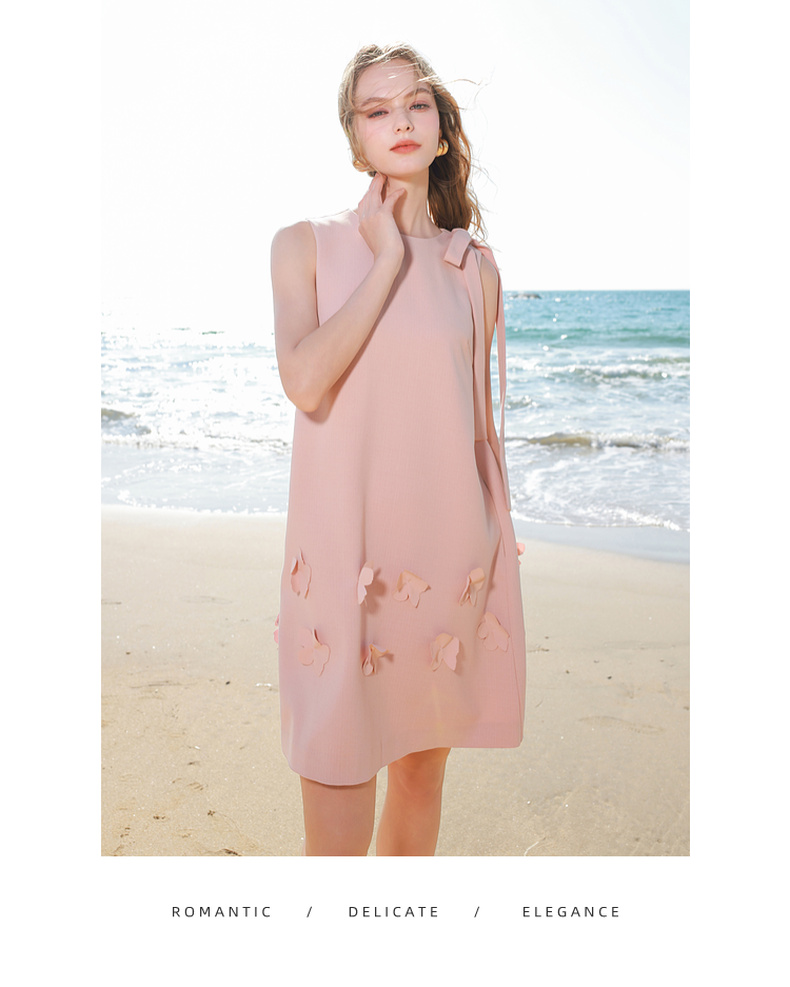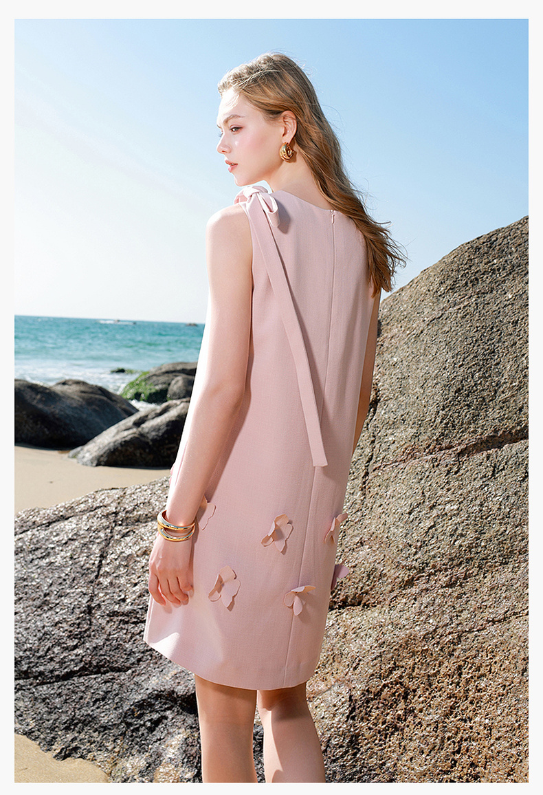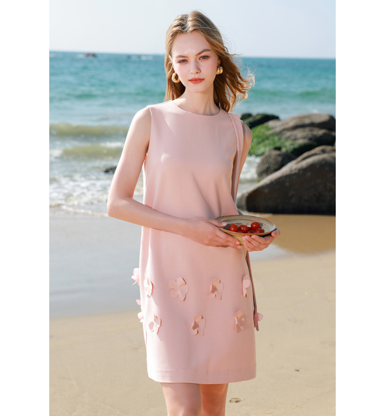 三彩2025夏季新款设计感飘带圆领连衣裙立体花朵无袖短裙M