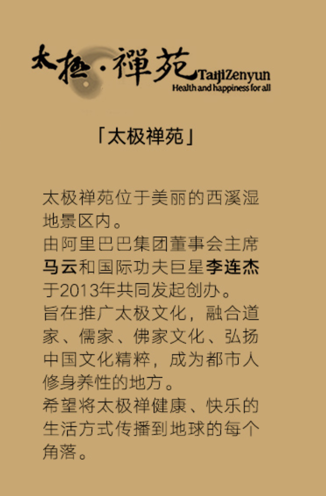 太极禅苑由马云与李连杰于2013年在杭州西溪湿地创立,采用会员制运营,并成立了太极禅国际发展公司,由李连杰担任CEO