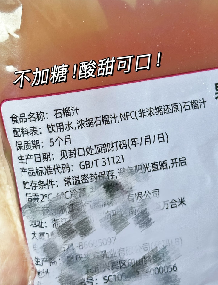 0添加蔗糖、0脂肪、0色素,好喝还健康 无添加,更安心 我们承诺,我们的100% NFC石榴汁不添加任何人工色素、香精或防腐剂。每一袋都经过严格的质量控制,确保您享受到最纯净、最健康的果汁。
