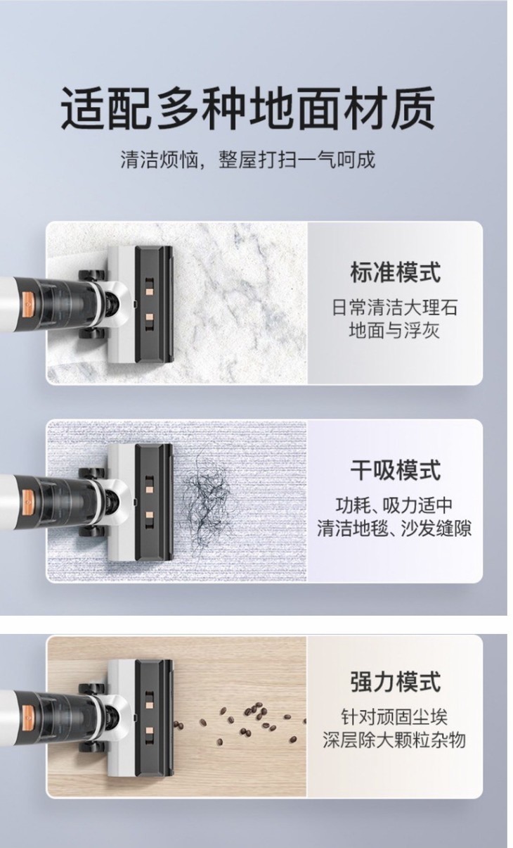 🔸三种清洁模式,干吸、标准力清洁模式,地板、地毯、瓷砖都能用,组合式地板的家庭用它,一次也能把整个房间打扫干净