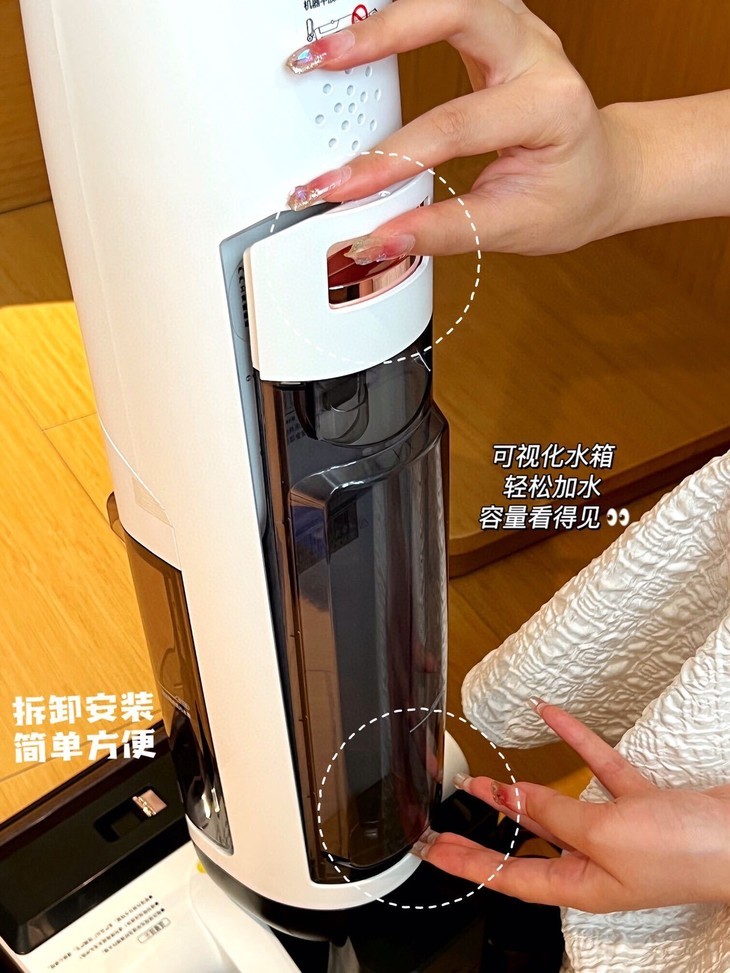 ✅组装简便,水箱、滚轮、底盘装卸便捷,照顾机身死角清洁,使用省力无负担。
