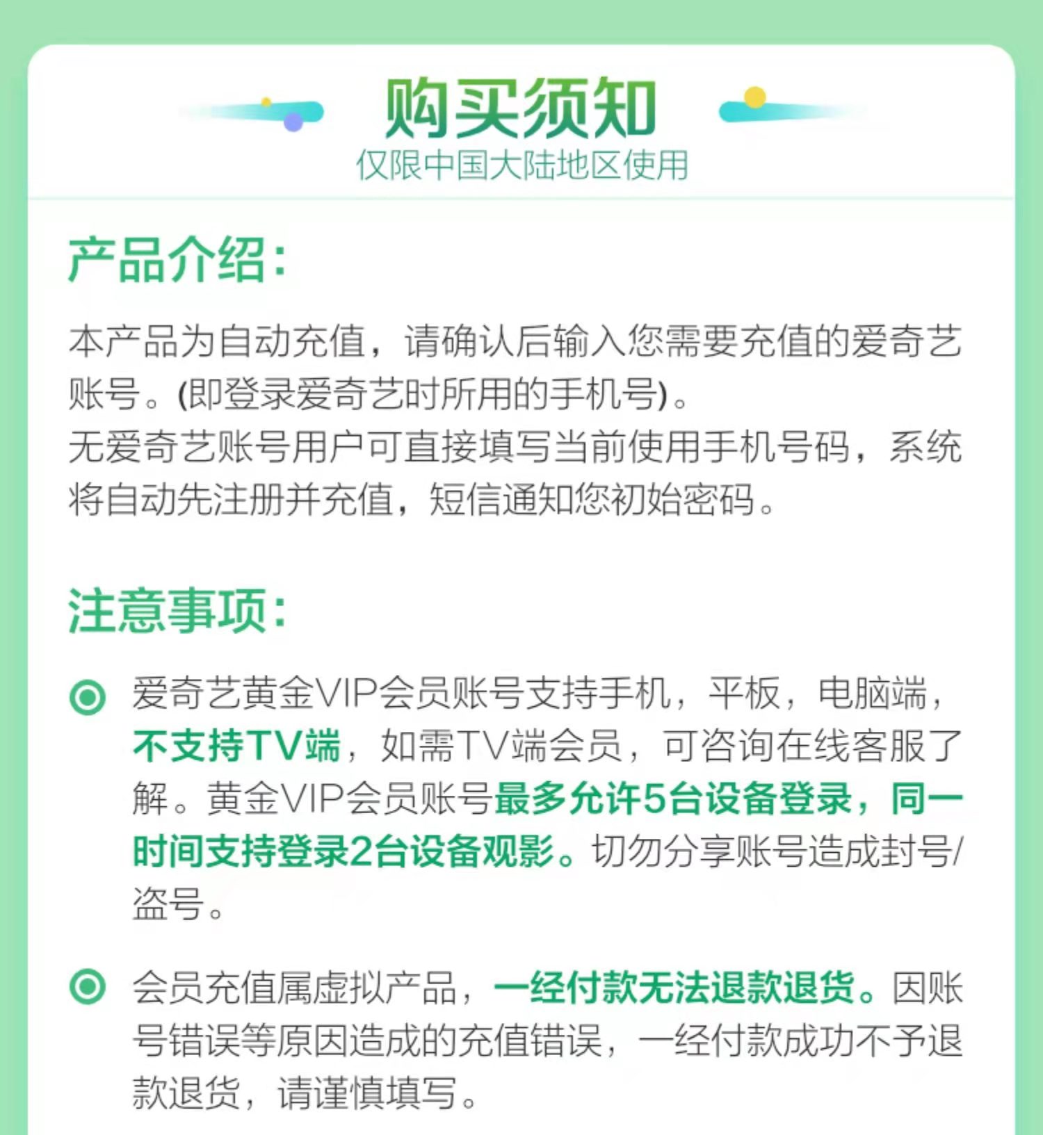▸下单时请再三确认好您爱奇艺APP绑定的手机号,这个是直充账户的。
