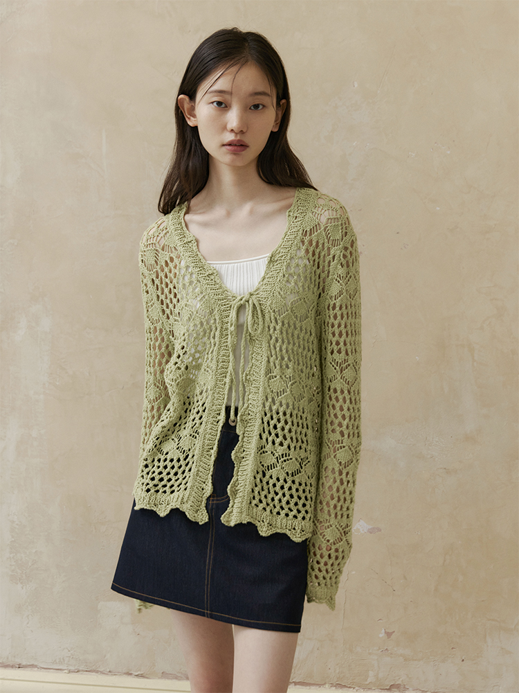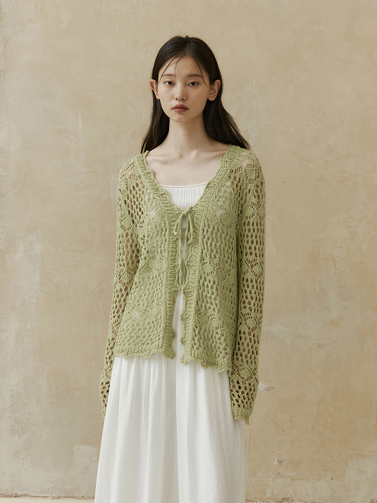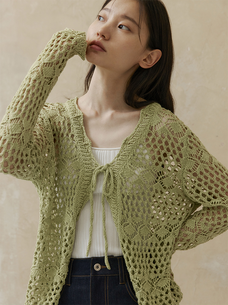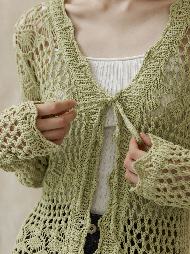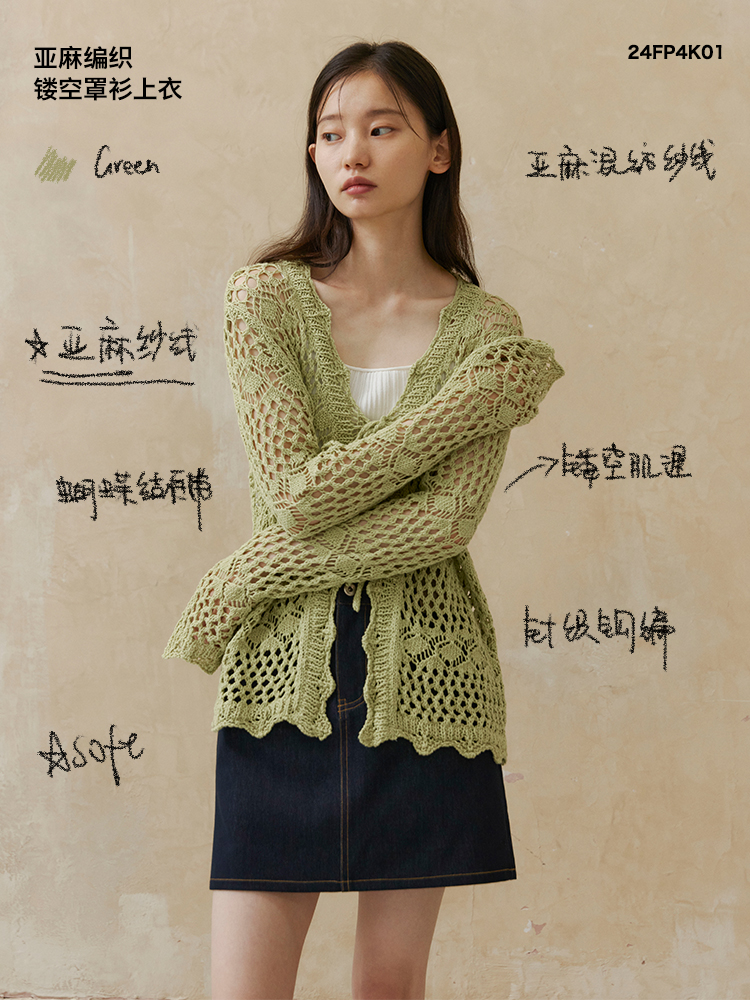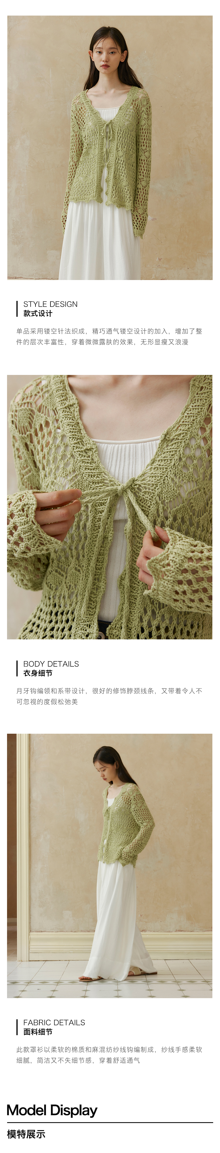 ForPoem 现货 24/SS原创设计亚麻编织镂空复古系带外搭针织罩衫上衣