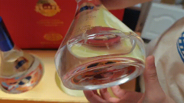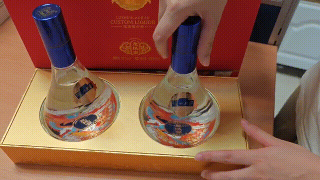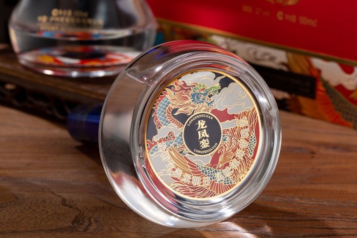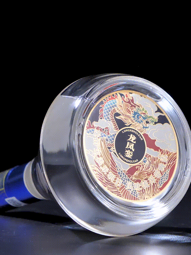 从瓶身侧面斜着往下看,底部的龙凤彩绘图还会在清透酒水的晕染下,展现出五彩斑斓的美丽画面,特别美丽!