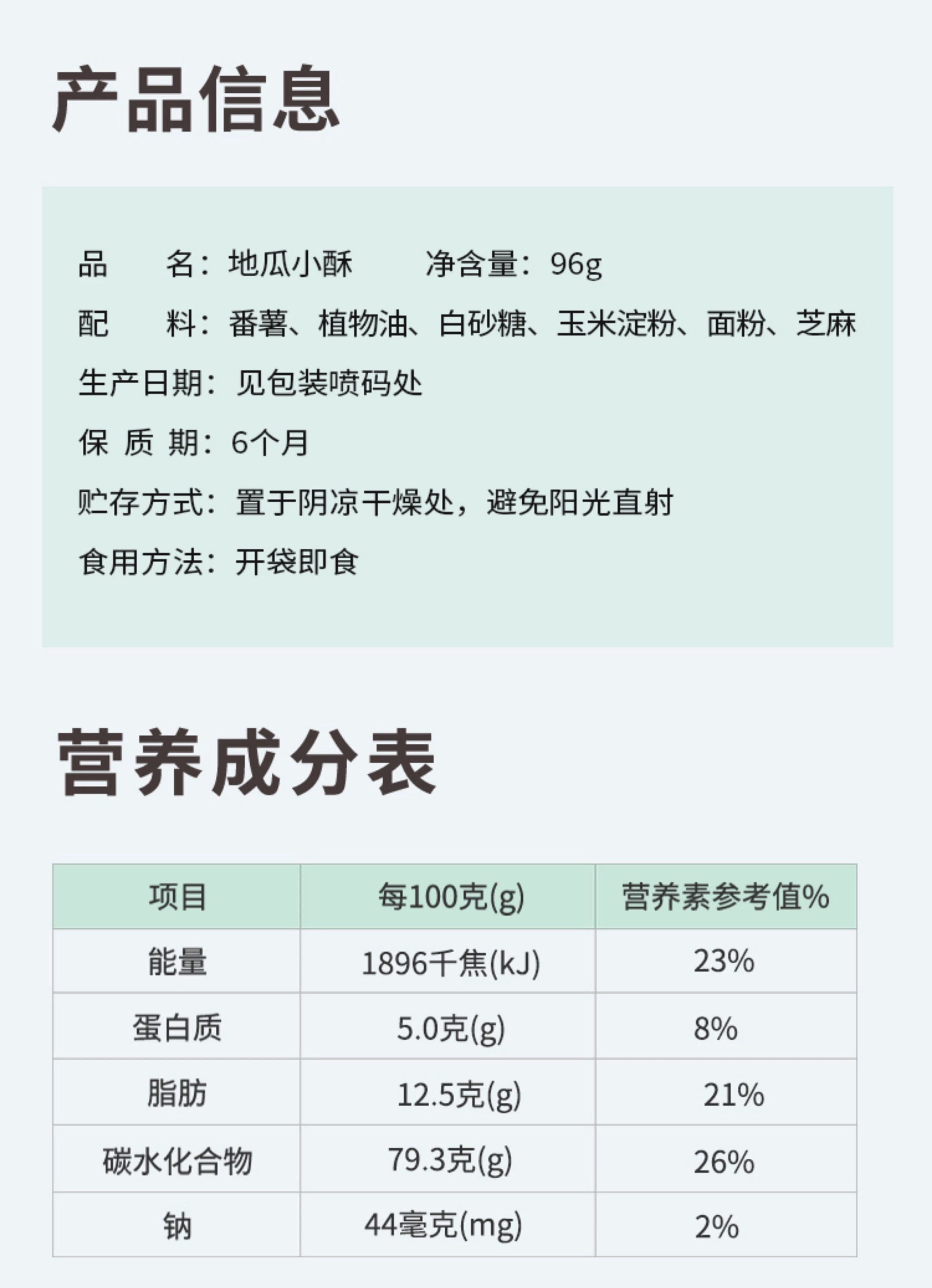【品名】:米惦地瓜小酥 【配料】:番薯、植物油、白砂糖、玉米淀粉、面粉、芝麻 【产品规格】:96g(6包/盒) 【保质期】:6个月 【发货地】:福建漳州 【发货时效】:72小时内发出 【发货快递】:中通、申通随机发不指定 【补运费地区】:甘肃、内蒙古、宁夏运费加14元,青海、新疆、西藏运费加16元,上海北京加1元。 【售后说明】: 1、食品无质量问题不支持 7 天无理由退换。 2、产品少发、漏发,质量问题,请提供产品连同快递单(需看见单号)一起拍照24 小时内发给客服核实处理。 3、如包裹破损、挤压严重请拍照签收,签单破损签收,请在签收48小时内拍照联系客服处理。 4、产品已经发出的情况下,不建议更改地址、不退货,下单前,请仔细核对信息!货物产生物流单号,无法拦截,如需拦截须支付快递费用。