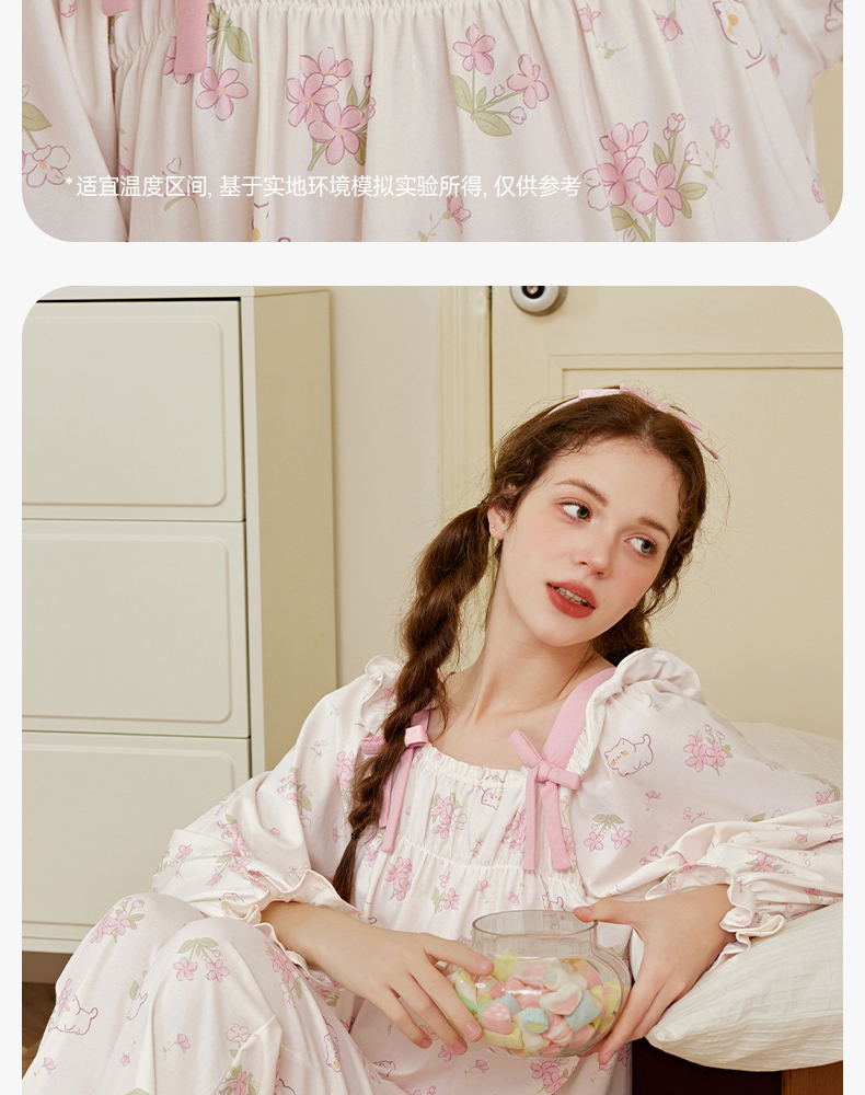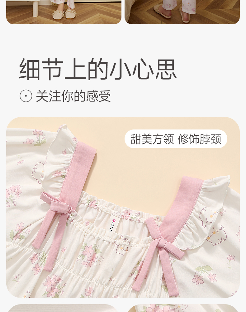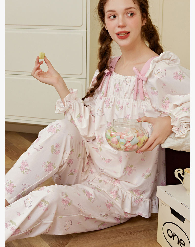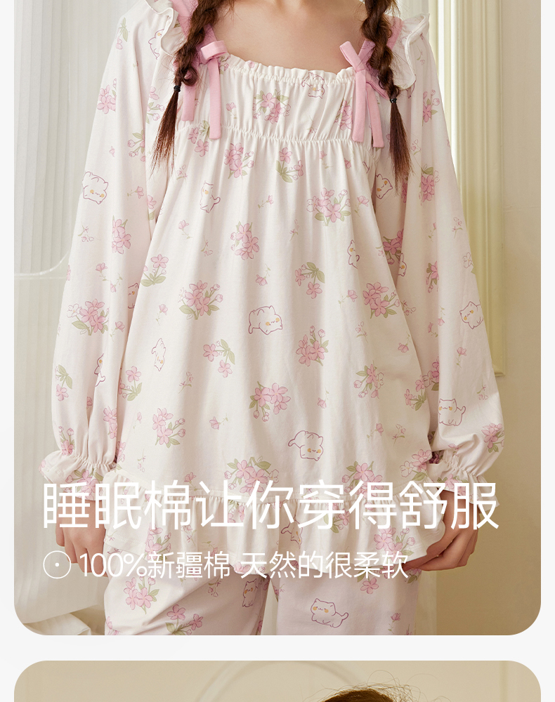 芬腾女士睡衣春秋季纯棉长袖方领套装女款宽松休闲大码全棉家居服