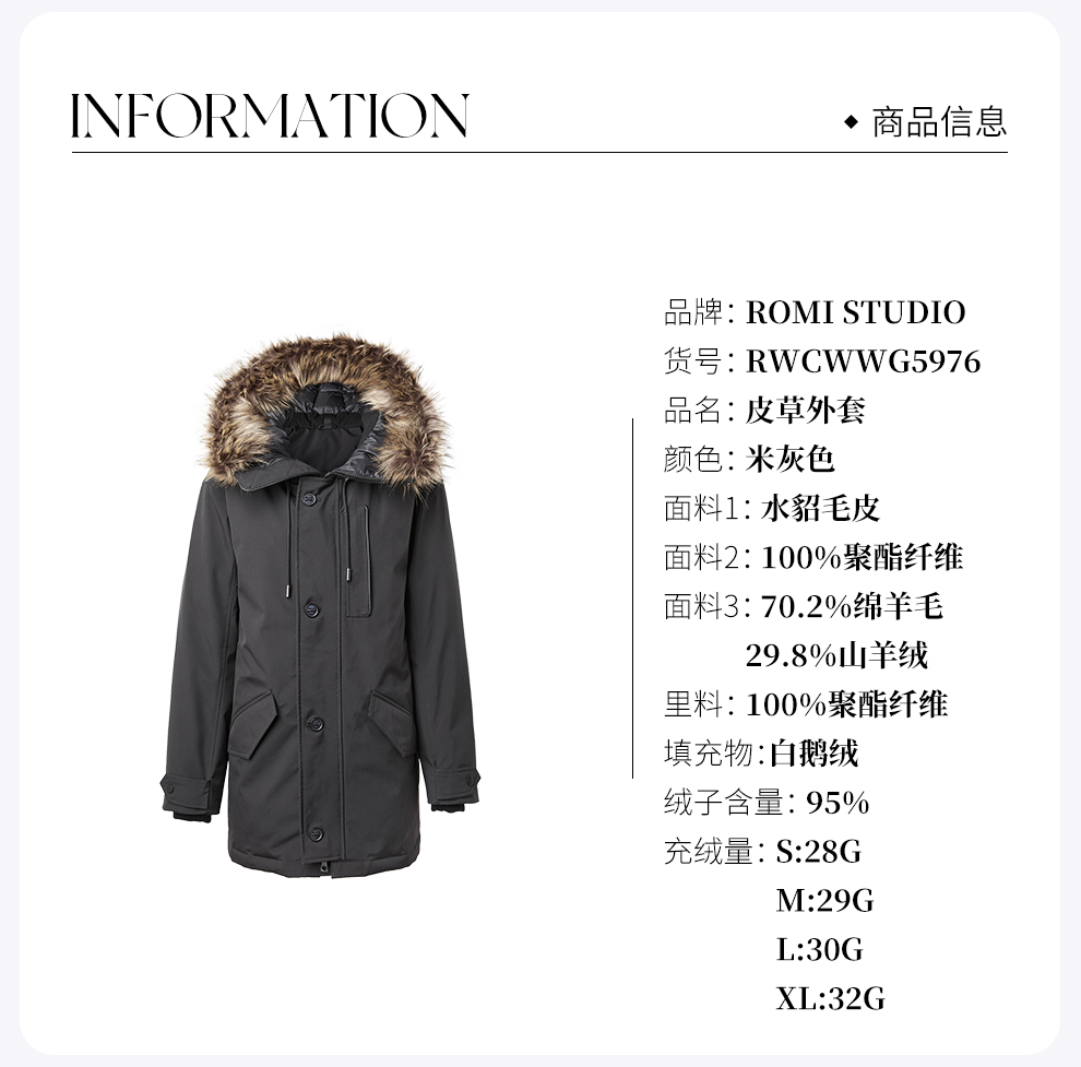 ROMI STUDIO“棕标系列*防风雨连帽派克高克重95白鹅绒服RWCWWG5976