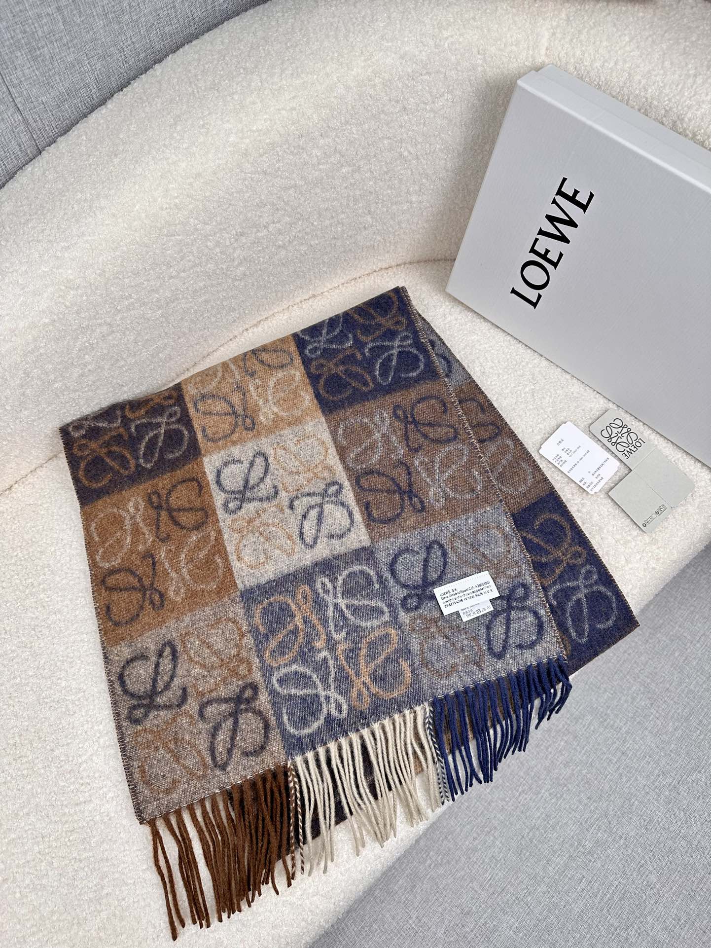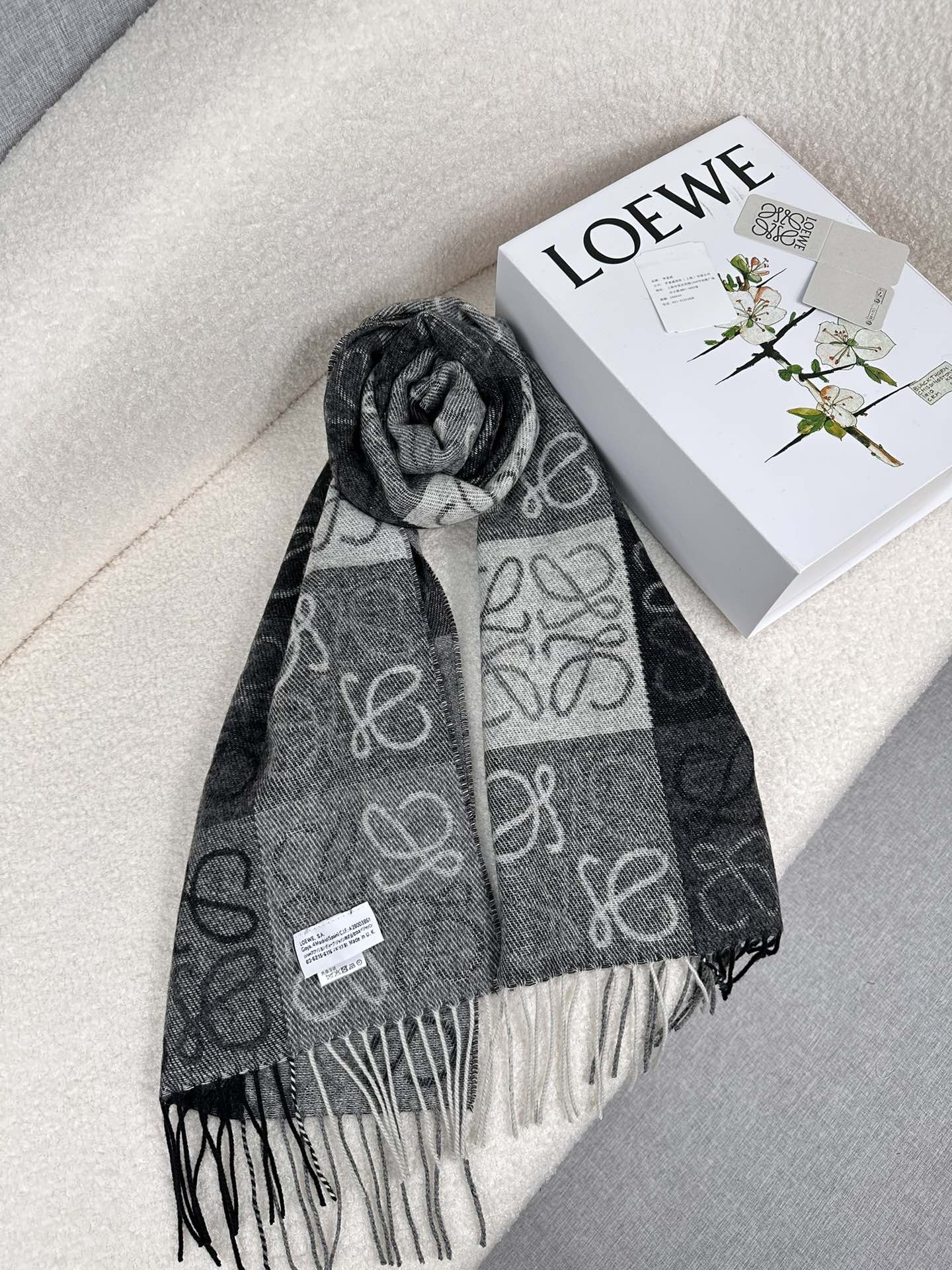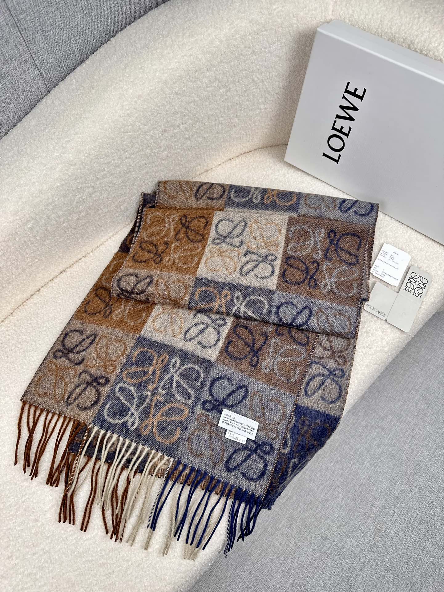 顶级中性款!罗意威很幸運拿到這個品牌的東西,真的不多見,很少在國內做訂單,款式真的少的可怜!羅意威作為西班牙的頂尖奢侈品牌,秉承傳統,技藝,熱誠,散髮獨特的西班牙貴族氣息!本款為巴塞羅納專櫃的櫥窗定制款!围巾整体构图为他们品牌最经典的LOGO风格设计。规格38x200,材质:90%羊毛10%羊绒!手感特别好!这个款式真的是太爆了、市场上多种F货出现。F货又扎手又薄,质感很差!这款是市场上最高版本的!!手感特别好.,细腻柔软!!原版标!!真的福利好货!!