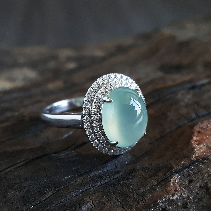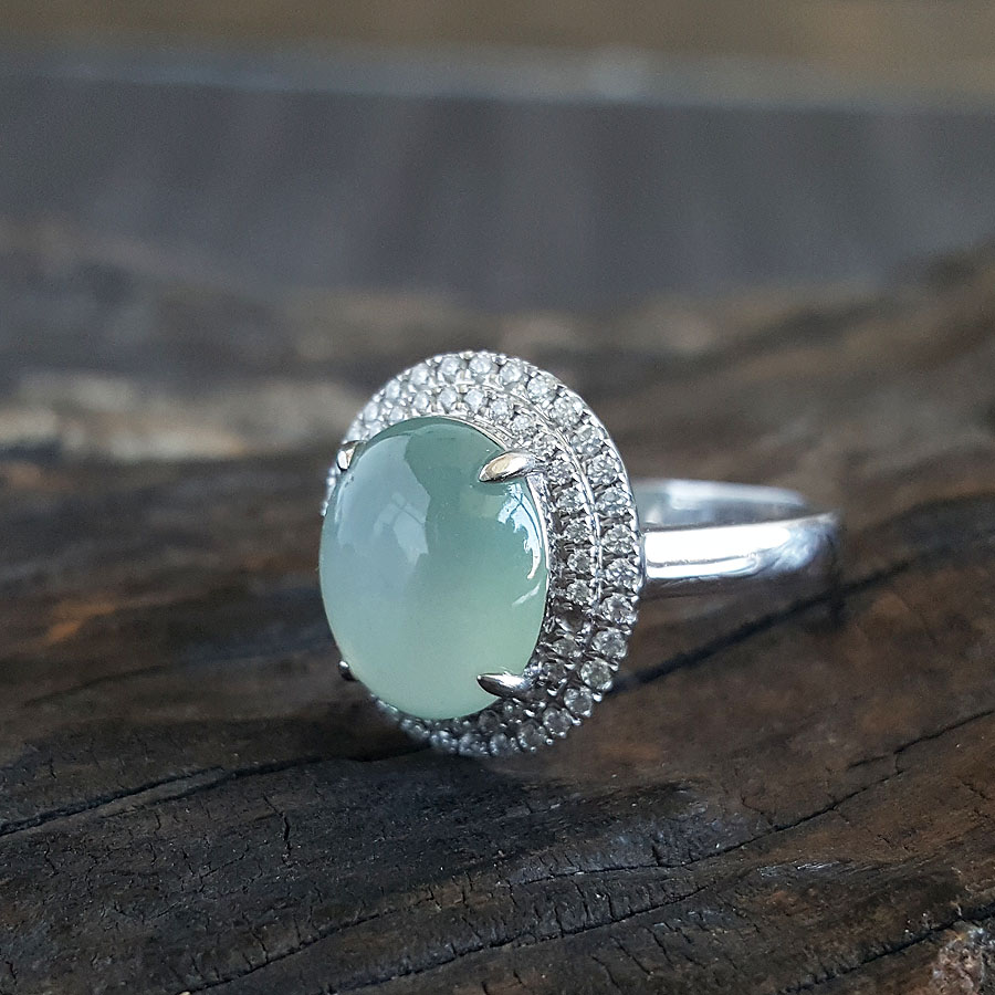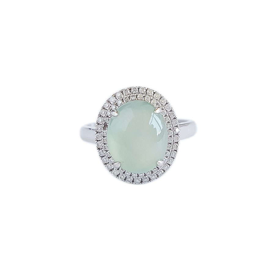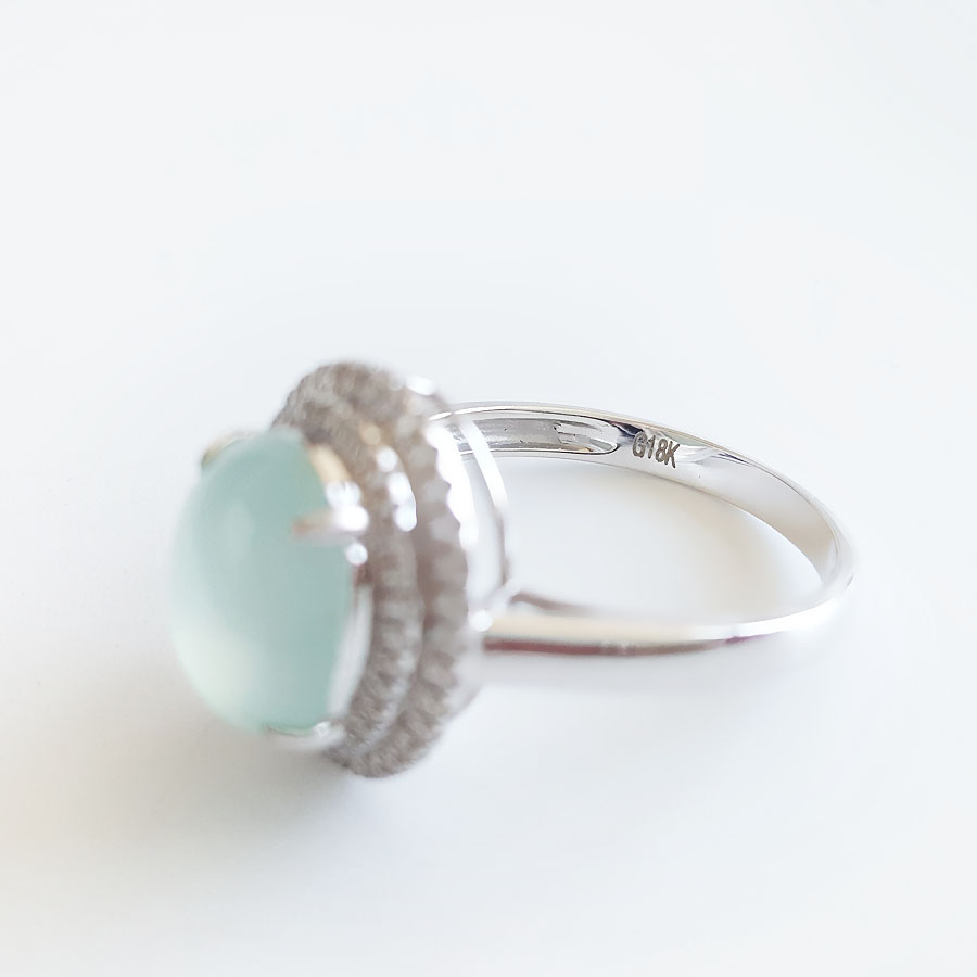 名称 | AU750白金镶钻镶天然冰种晴水绿蛋面翡翠(吉祥、圆满)戒指 |