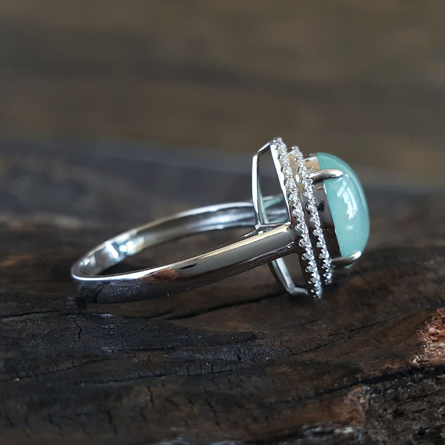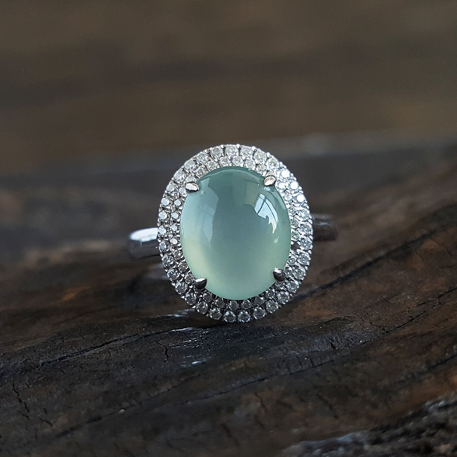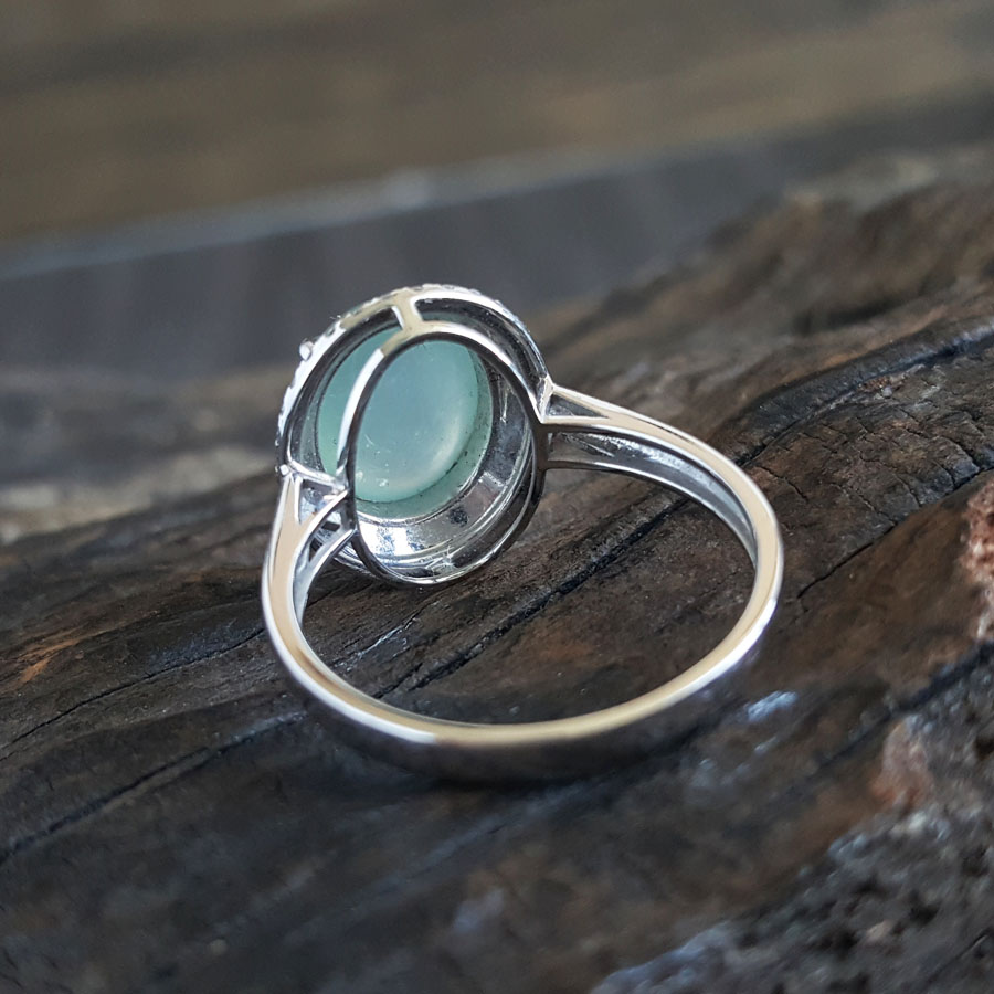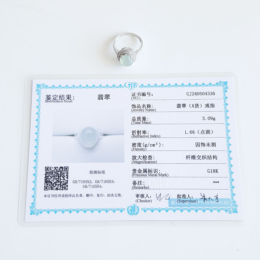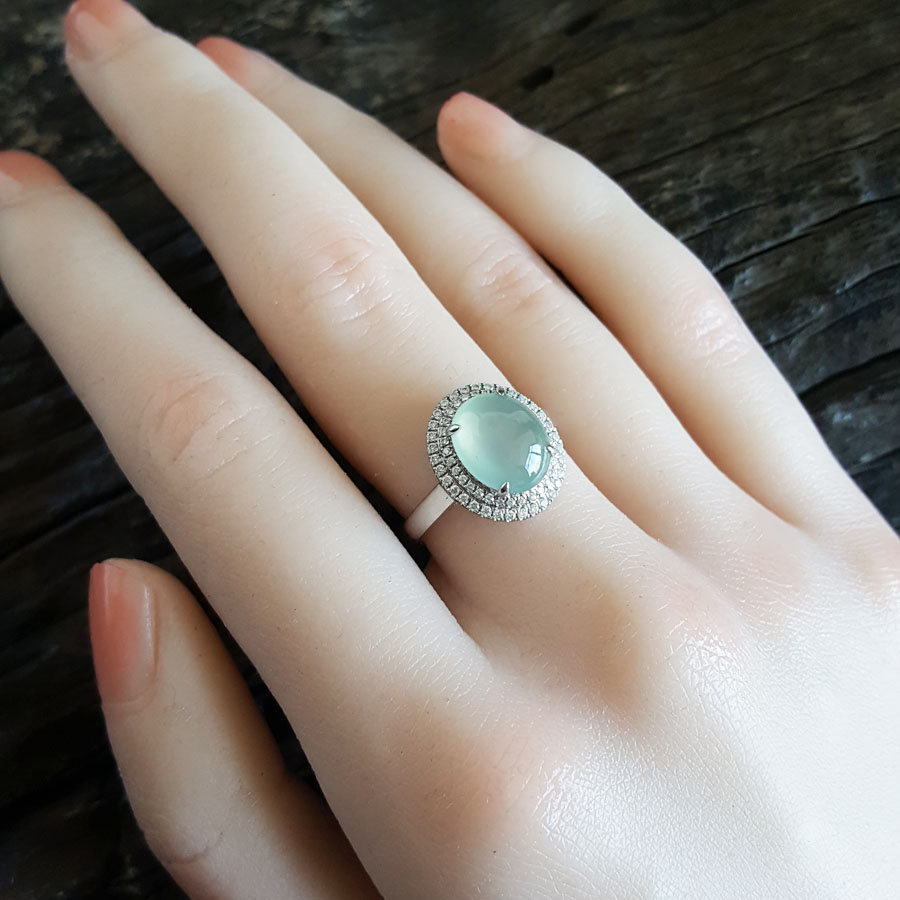 名称 | AU750白金镶钻镶天然冰种晴水绿蛋面翡翠(吉祥、圆满)戒指 |