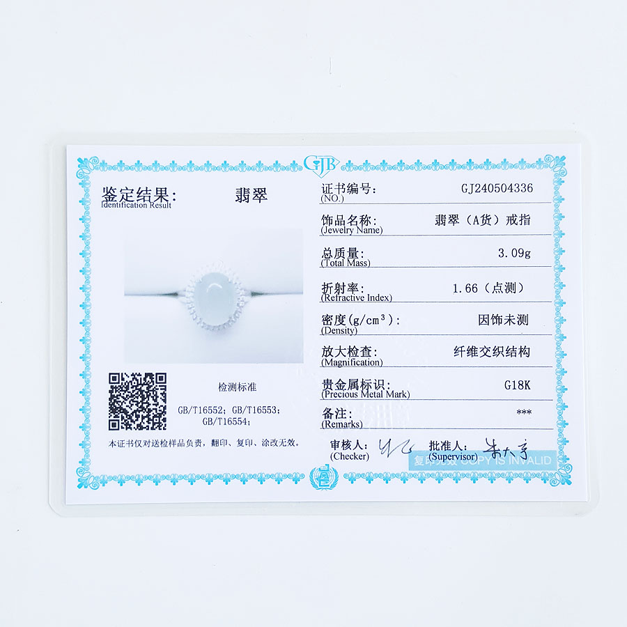 【天然正品】AU750白金镶钻镶天然冰种晴水绿蛋面翡翠(吉祥、圆满)戒指030824XY02