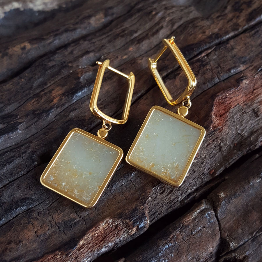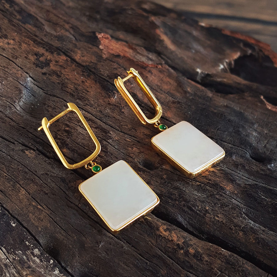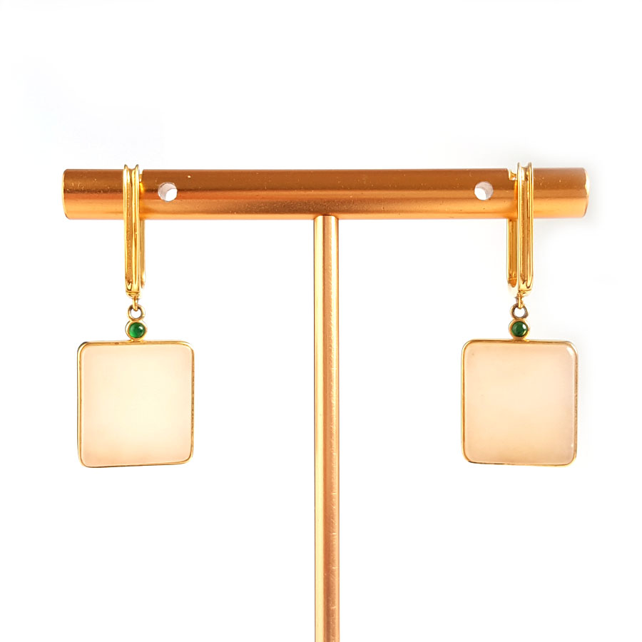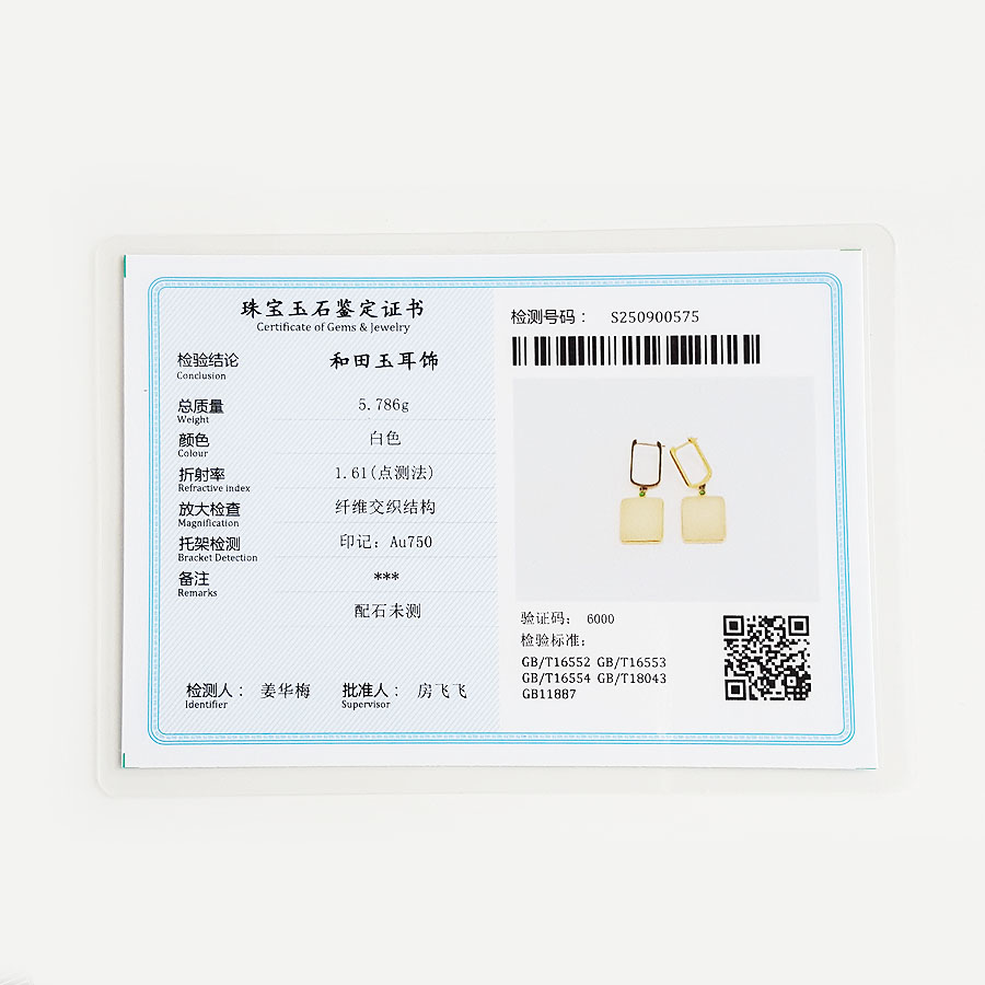 名称 | AU750黄金镶天然新疆籽料无事牌造型和田玉(平安、吉祥)耳环 |